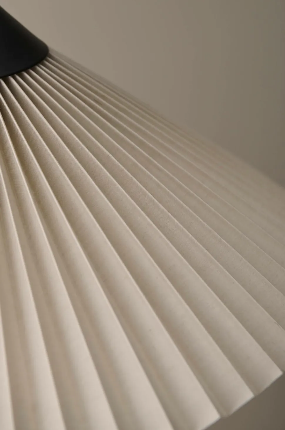 Gulvlampe med fod af metal i matsort finish og skærm af plisseret tekstil. Skærmen kan rettes lidt i alle retninger. Sort ledning med strømafbryder ved gulvet.