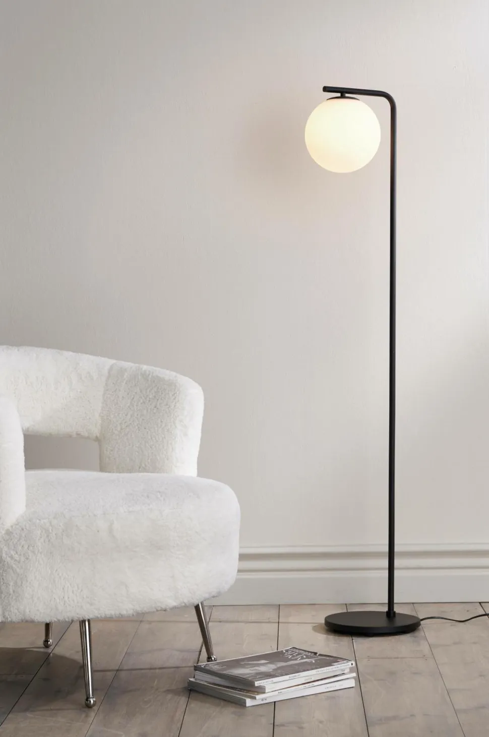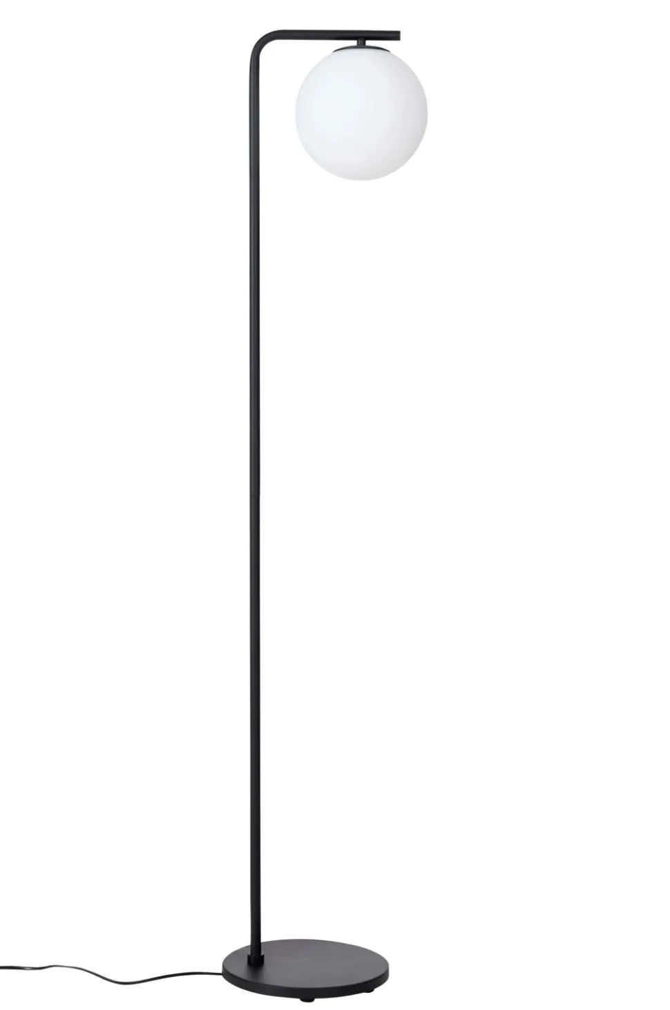 Gulvlampe af metal. Kuppel i opalhvidt glas, diameter 20 cm. Kuplen fastgøres og løsnes med skruefunktion. Bundplade mål: Diameter 25 cm, højde 1,5 cm. Sort plastledning med fodafbryder.