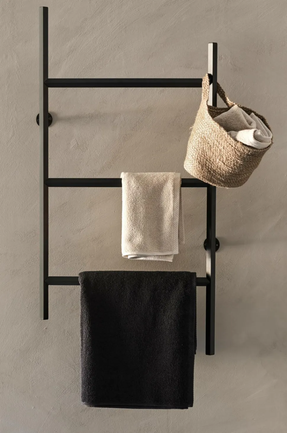 Håndklædeholder til vægophængning. Af sortmalet metal. Ikke med varme. Samlet.