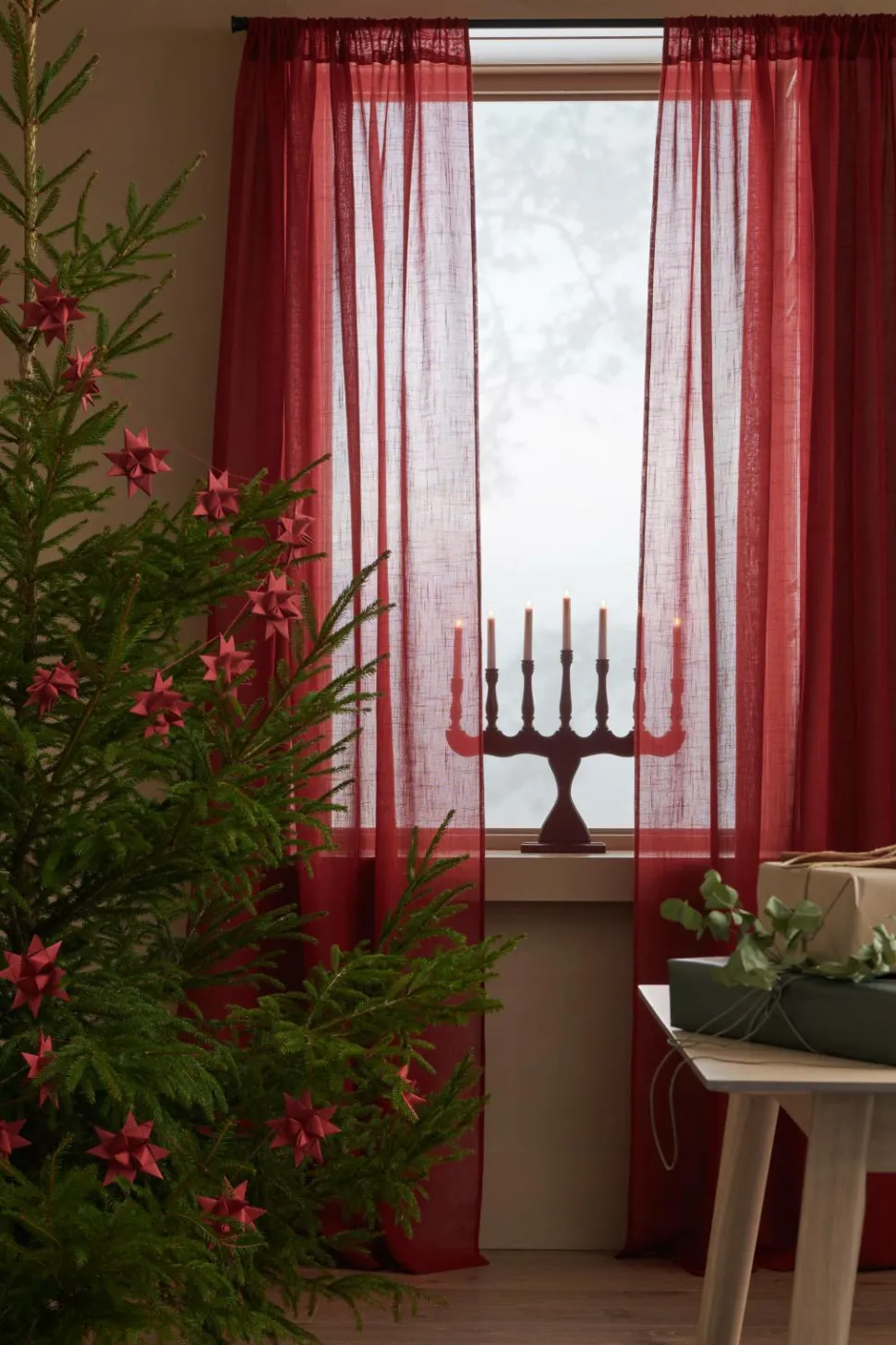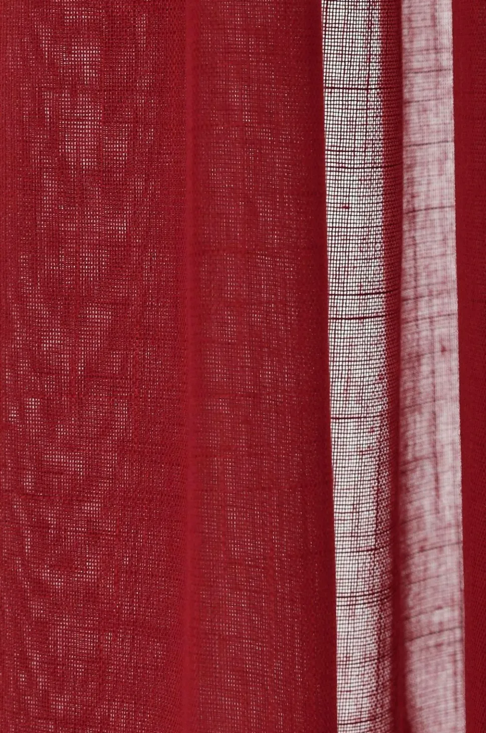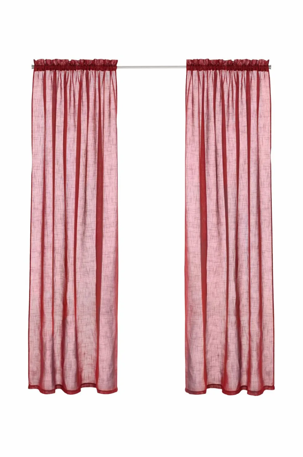 To gardinlængder med løbegang af luftig polyester med struktur i hørlook. 5 cm rynkekant. Bredde 134 cm. To længder: 220 og 250 cm.