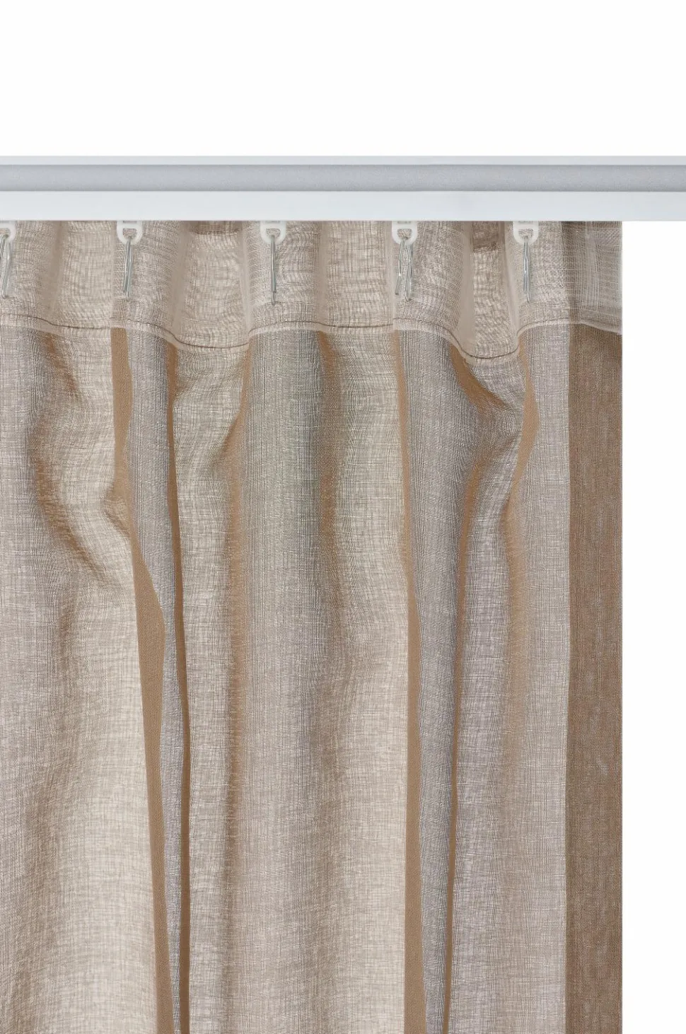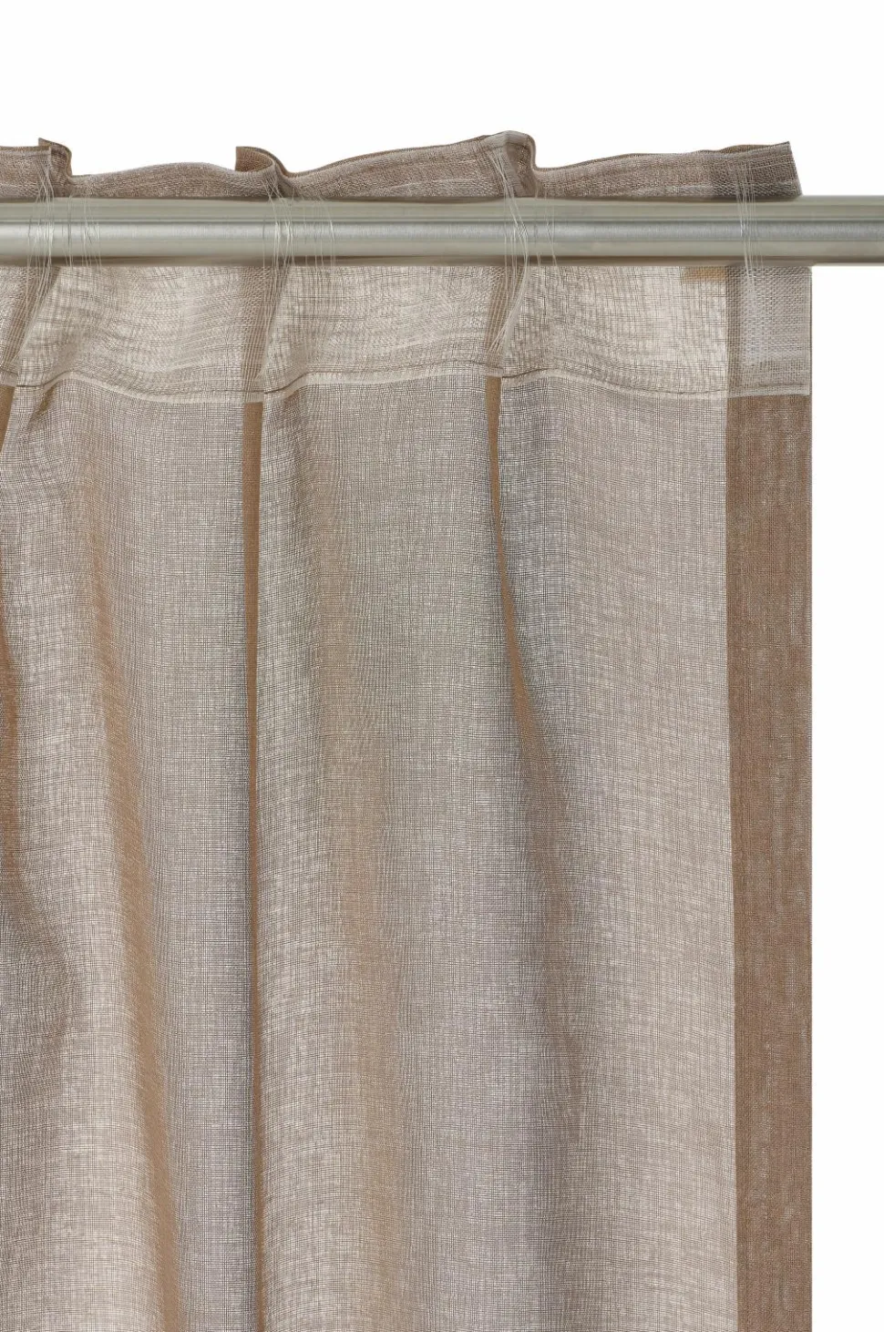 KIRA er et dejligt gennemsigtigt gardin med en smuk, lidt mere sparsom vævning. Lyset filtreres og falder blødt ind i rummet, og hvis du vil skærme for solens stråler eller begrænse gennemsigtigheden, kan du trække gardinet for og stadig få lyset ind. Gardinet har et let fald, og du kan kombinere det med et tungere mørklægningsgardin for at få en luksuriøs hotelfornemmelse. Det bløde farveskema passer godt til stoffets fornemmelse. KIRA-gardinet er fremstillet af certificeret genbrugspolyester. Længderne har påsyet, transparent multifunktionelt bånd i toppen, og det kan hænges op med fingerkroge, en kanal og en skjult bøjle.