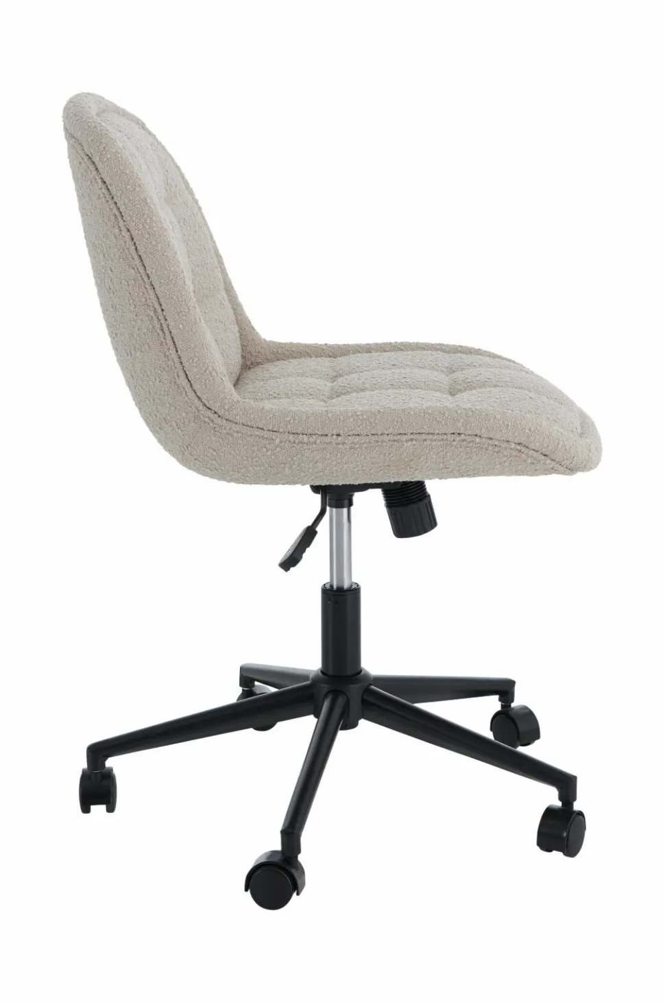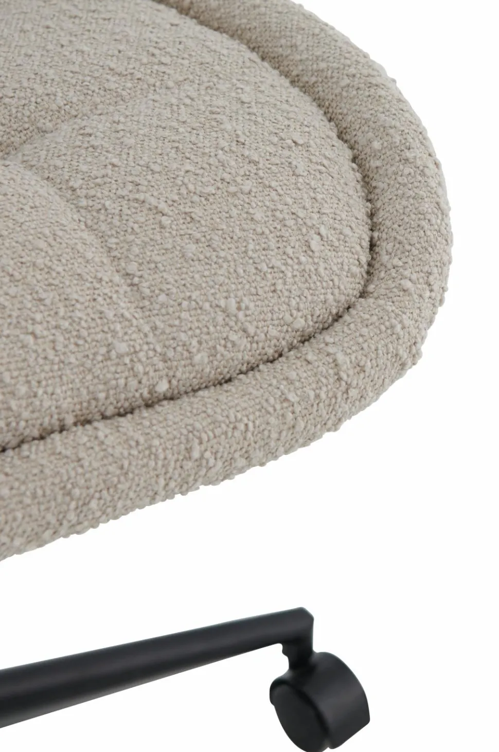 Kontorstol/skrivebordsstol med vatteret sæde og betræk i boucléstof. Ben i pulverlakeret metal med hjul. Vippemekanisme og drejefunktionsplade.