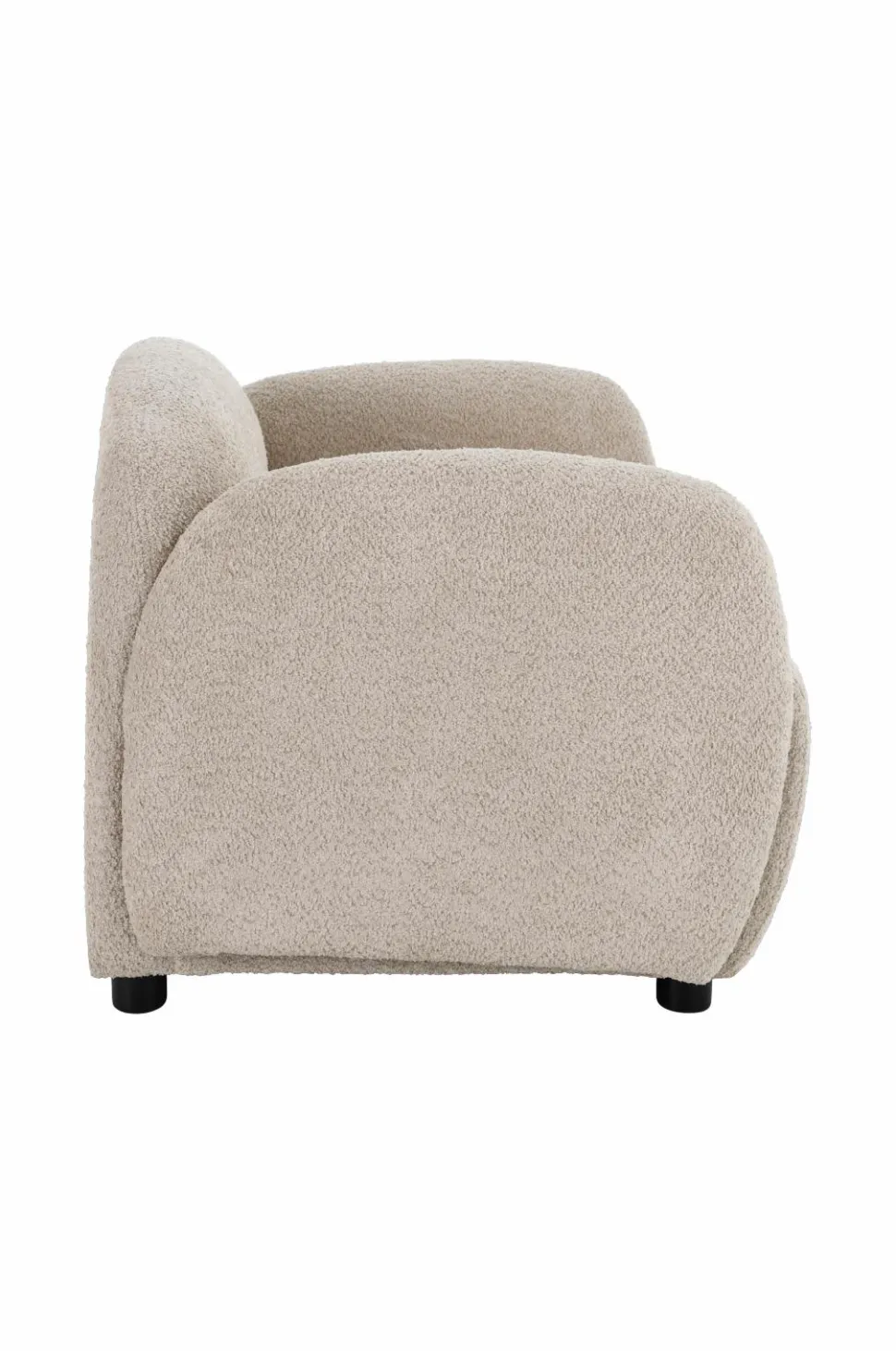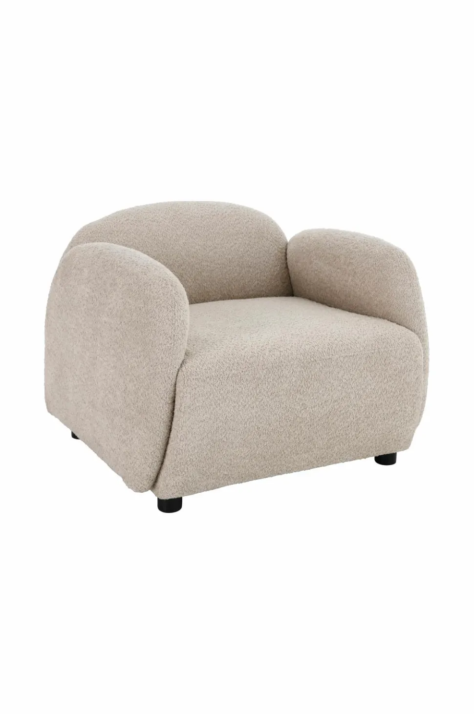 Lænestol med meget blødt betræk i bouclé. Stel af eukalyptustræ. Skumfyld. Maks. belastning 150 kg.