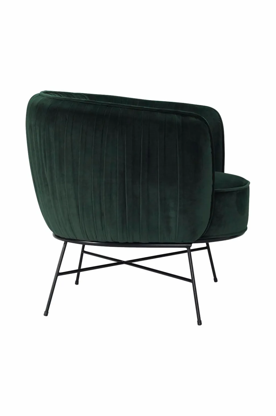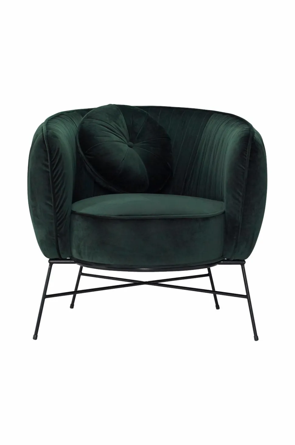 Lænestol med betræk i velour. Overdel med rynket stof på både yder- og indersiden. Pyntepude i velour med beklædt knap medfølger. Træstel. Understel og ben af pulverlakeret metal. Polstring af polyether.