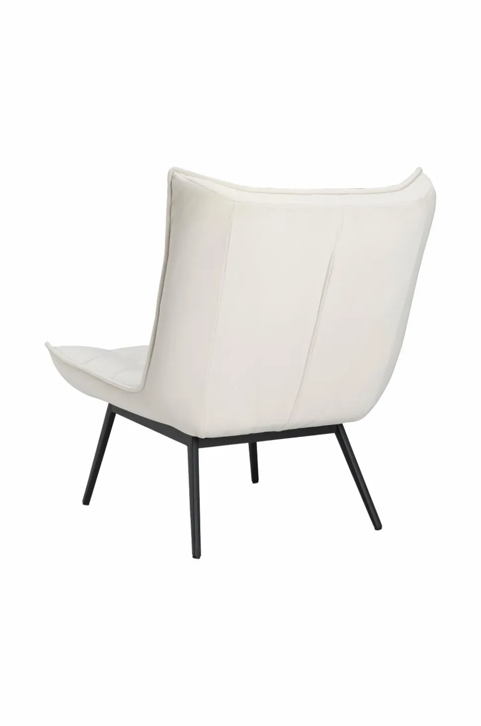 Lænestol med paspoleret kant rundt om. Indfældninger, der danner et dekorativt ternet mønster. Skumfyld. Ben af metal. Lettere samling.