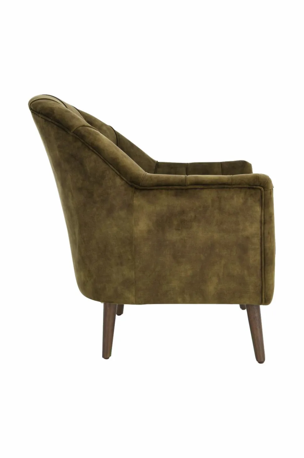 Lænestol med ben og stel i gummitræ. Betræk i meleret velour med smuk glans. Knapper på indersiden. Lettere samling.