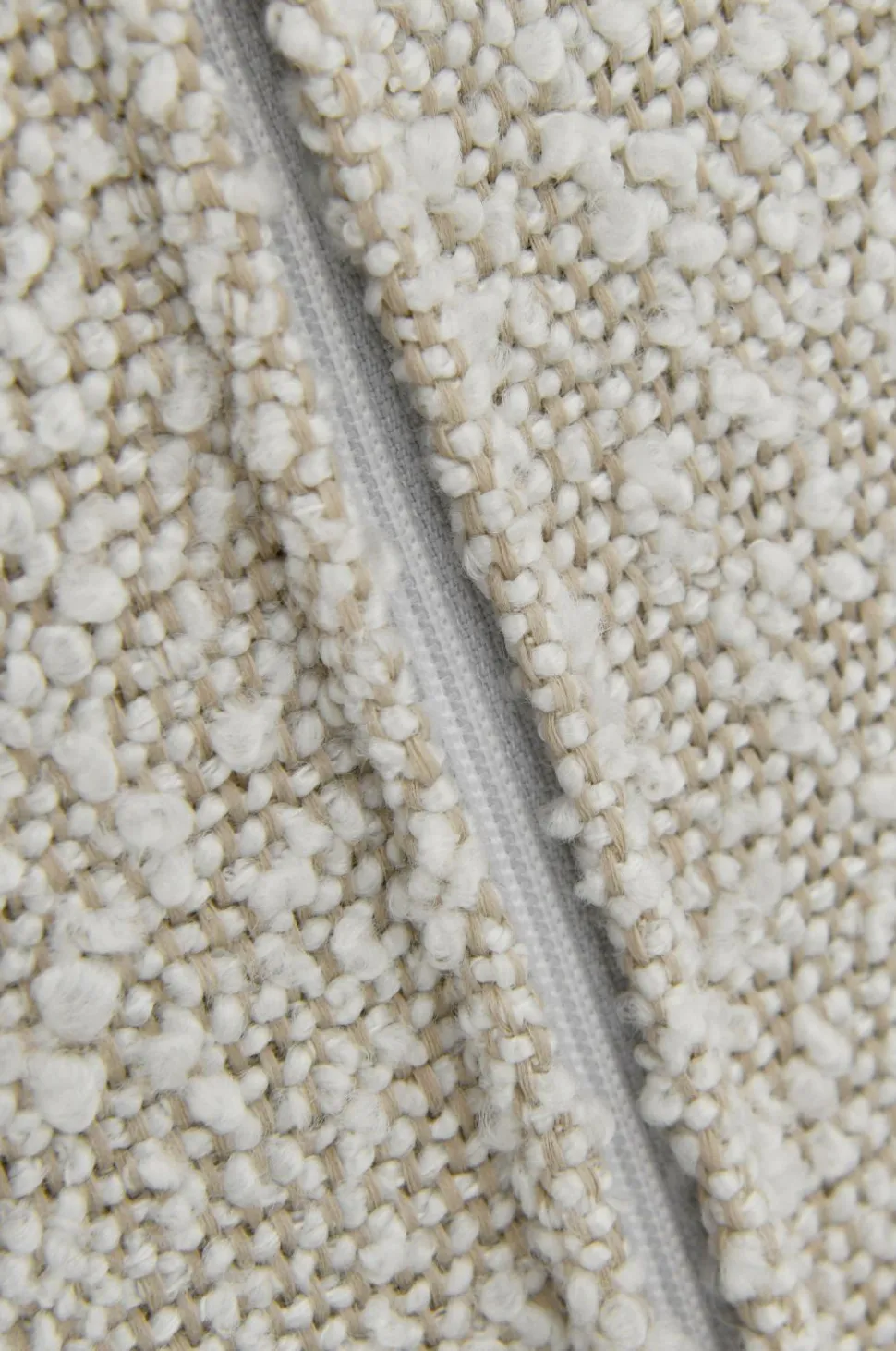 Lænestol med paspoleret kant rundt om. Betræk i bouclé med indfældninger, der danner et dekorativt ternet mønster. Skumfyld. Ben af metal. Lettere samling.
