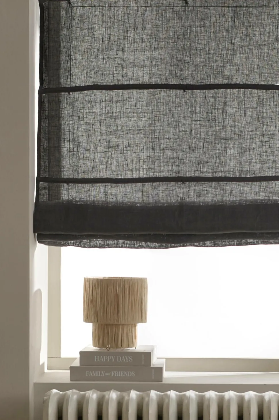Liftgardin af hør i vasket, tynd vævet kvalitet. Leveres færdigmonteret med træpinde foroven og metalpinde forneden. Længde 160 cm. Findes i flere forskellige bredde.