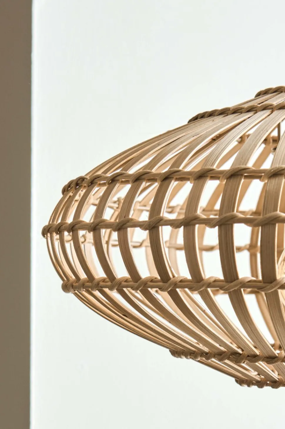 Loftlampe med skærm i naturfarvet bambus. Sort ledning og sort baldakin i plast. Samlet højde ca. 150 cm, kan afkortes til ønsket højde. Monteres med krogophæng. Pære medfølger ikke. Ujordet.