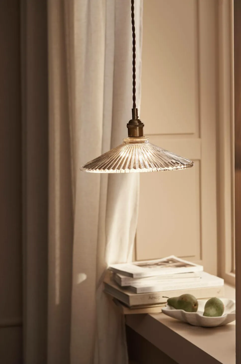 • Loftslampe i gennemsigtig glas og metal med en messingfinish