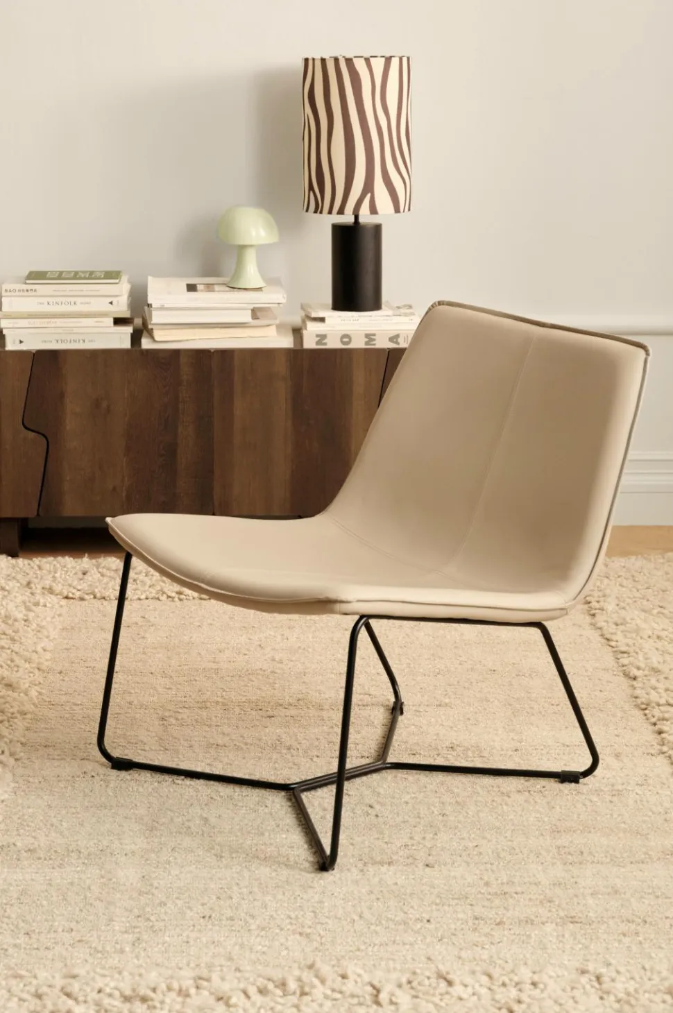 Loungestol i PU-læder (imiteret skind) med et levende tone-i-tone-mønster og jeanssøm midt foran på sæde og ryg. Ben af pulverlakeret metal. Skumfyld.