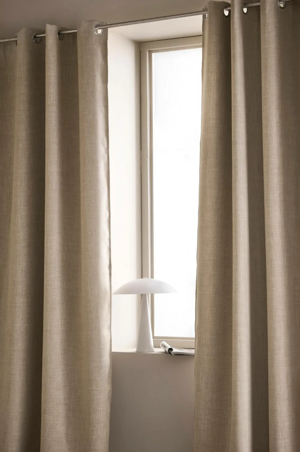 Mørklæggende gardin i hørlook med struktur og meleret effekt. Sejlringe i sølvfarvet metal. Et vævet mellemlag med indvævede sorte tråde gør, at gardinet lukker lyset ude. Matchende farve tone-i-tone på bagsiden. Bredde 140 cm. 2 længder: 220 og 250 cm. Stryges fugtige ved middelvarme på bagsiden.