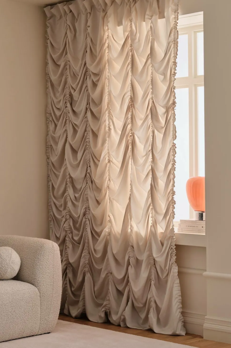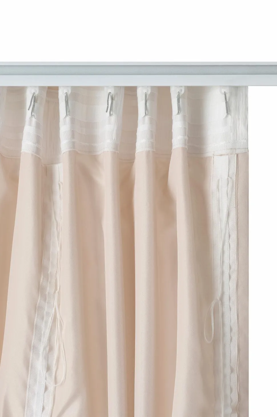 • Gardinet har indsyede lodrette snore, som gør det muligt at trække det op og skabe stilfulde, draperede effekter. Gardinet kan trækkes op til maksimalt ca. 60 cm. Snorene kan skjules i folden i bunden.
