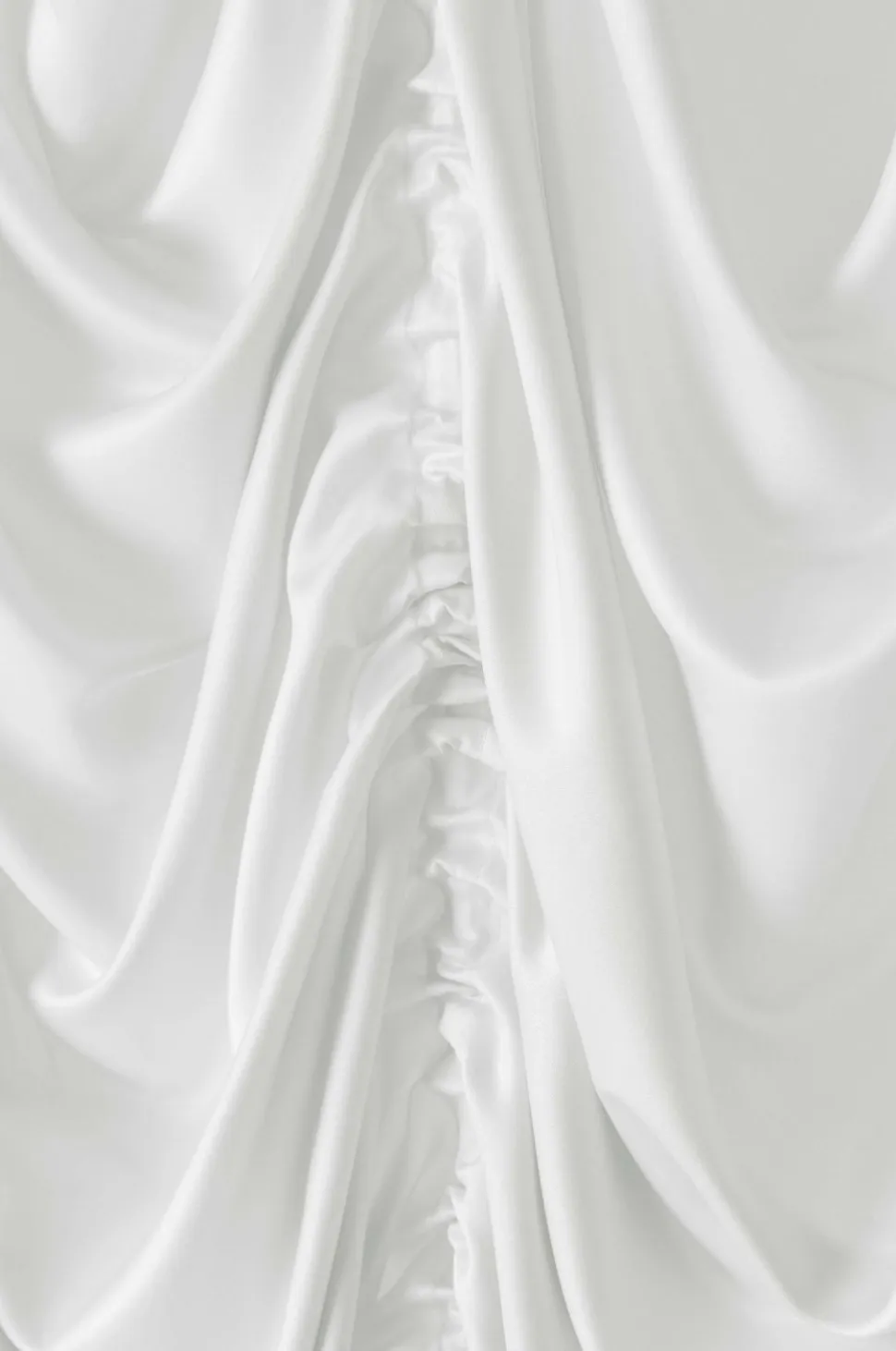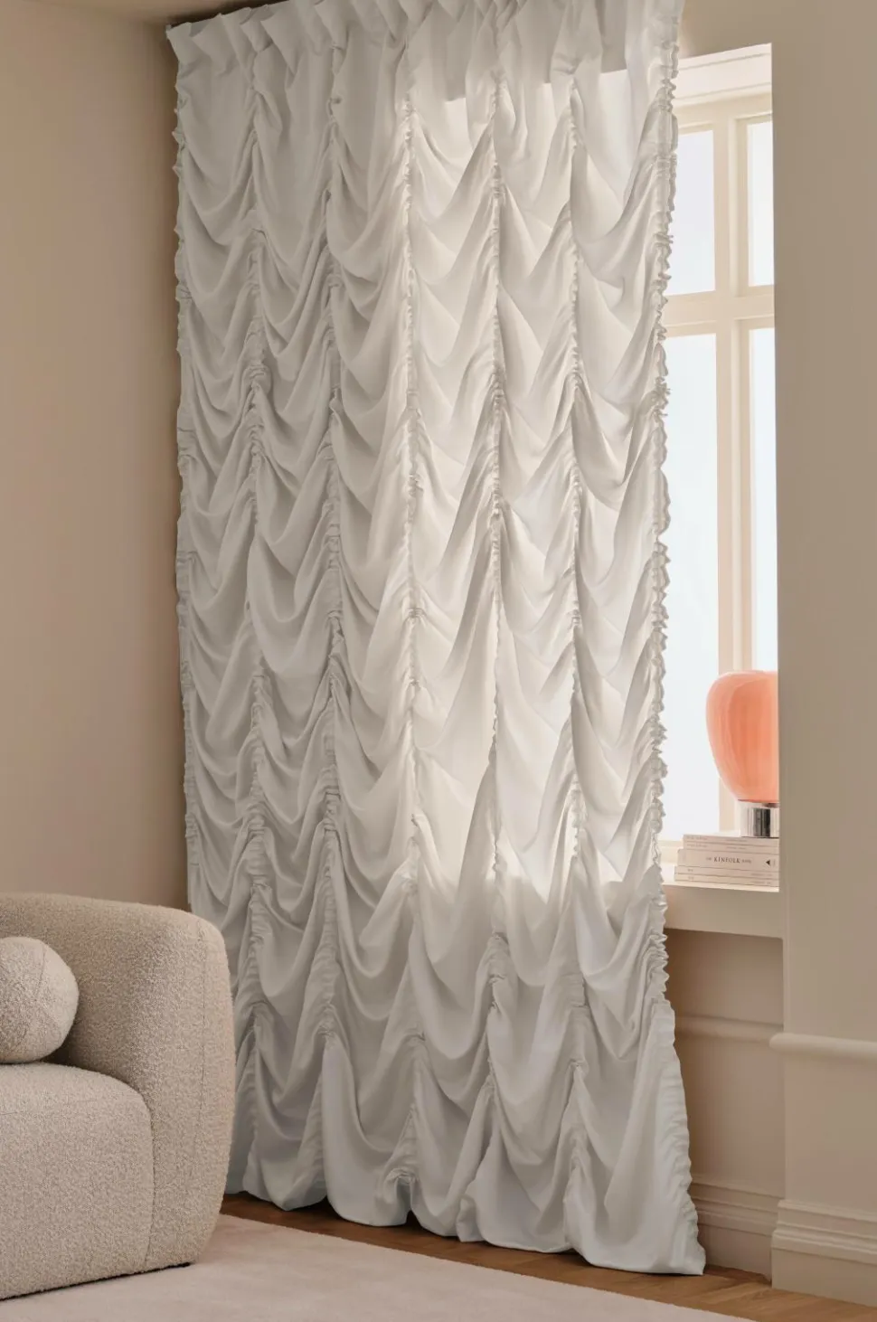 • Gardinet har indsyede lodrette snore, som gør det muligt at trække det op og skabe stilfulde, draperede effekter. Gardinet kan trækkes op til maksimalt ca. 60 cm. Snorene kan skjules i folden i bunden.