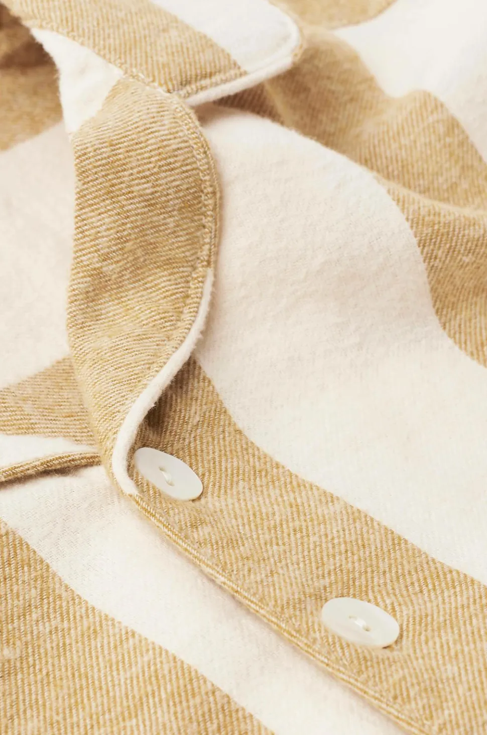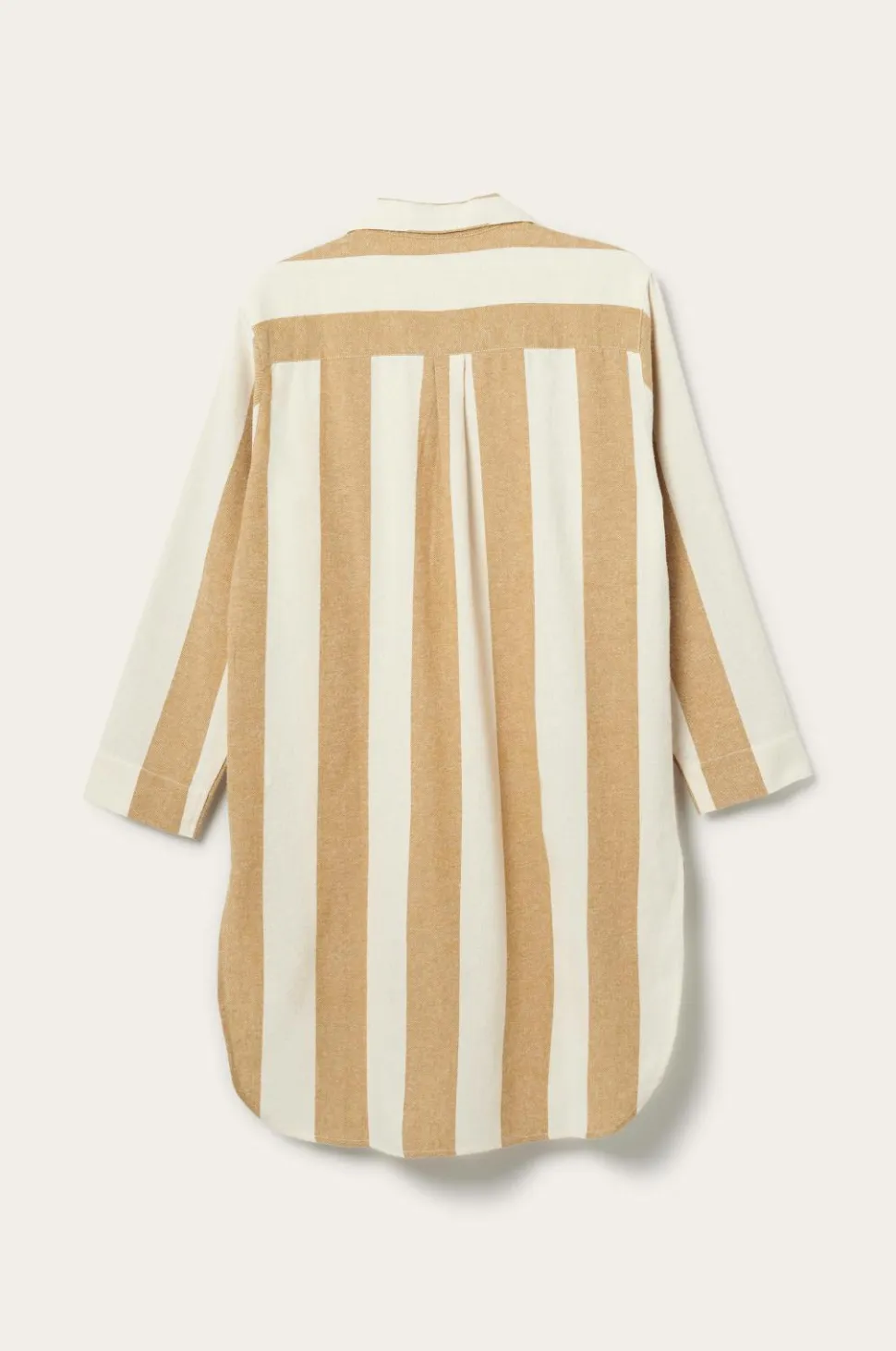 Natskjorte i flonel af økologisk bomuld med garnfarvede striber. Vasket kvalitet med blød, børstet overflade. Knælang model med tre perlemorsknapper og en brystlomme. Bærestykke med læg bagpå. Paspolerede kanter på revers, brystlommen og i ærmekant. Længere bagpå med afrundet kant forneden. Længde ca. 98 cm i str. S.