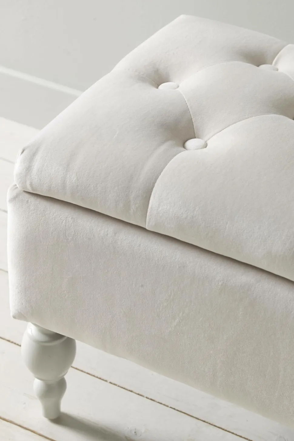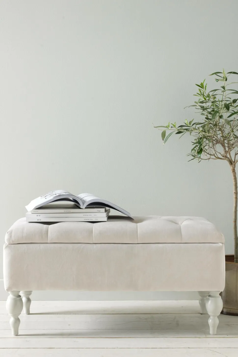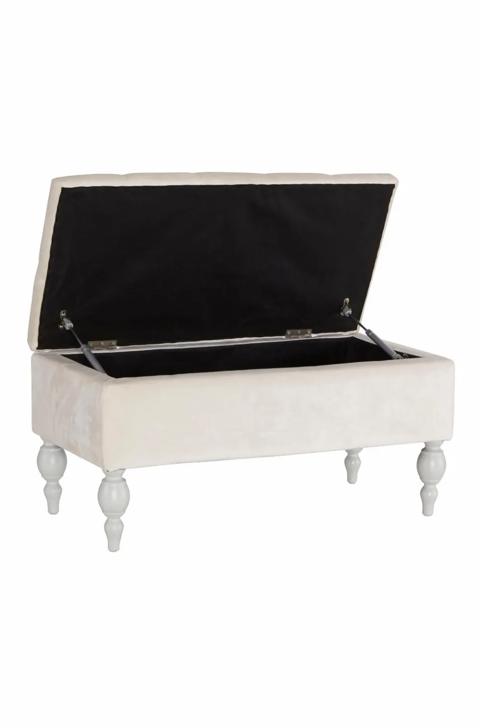 Opbevaringsbænk med betræk i polyestervelour. Stel af fyrretræ og plywood. Ben i gummitræ. Polstring af polyether. Opbevaringsrum i bænken, klap, der kan vippes op med hængsel og gasfjedre, der gør, at klappen åbnes og lukkes blidt og dæmpet uden klemmerisiko. Bredde 80 cm, dybde 40 cm, højde 40 cm. Mål indvendigt: 30×70 cm. Frihøjde 16 cm. Maks. belastning 130 kg. Lev. samlet. Produktet indeholder FSC-certificeret træ, som er fældet i et ansvarsfuldt skovbrug, der tager hensyn til mennesker og miljø.
