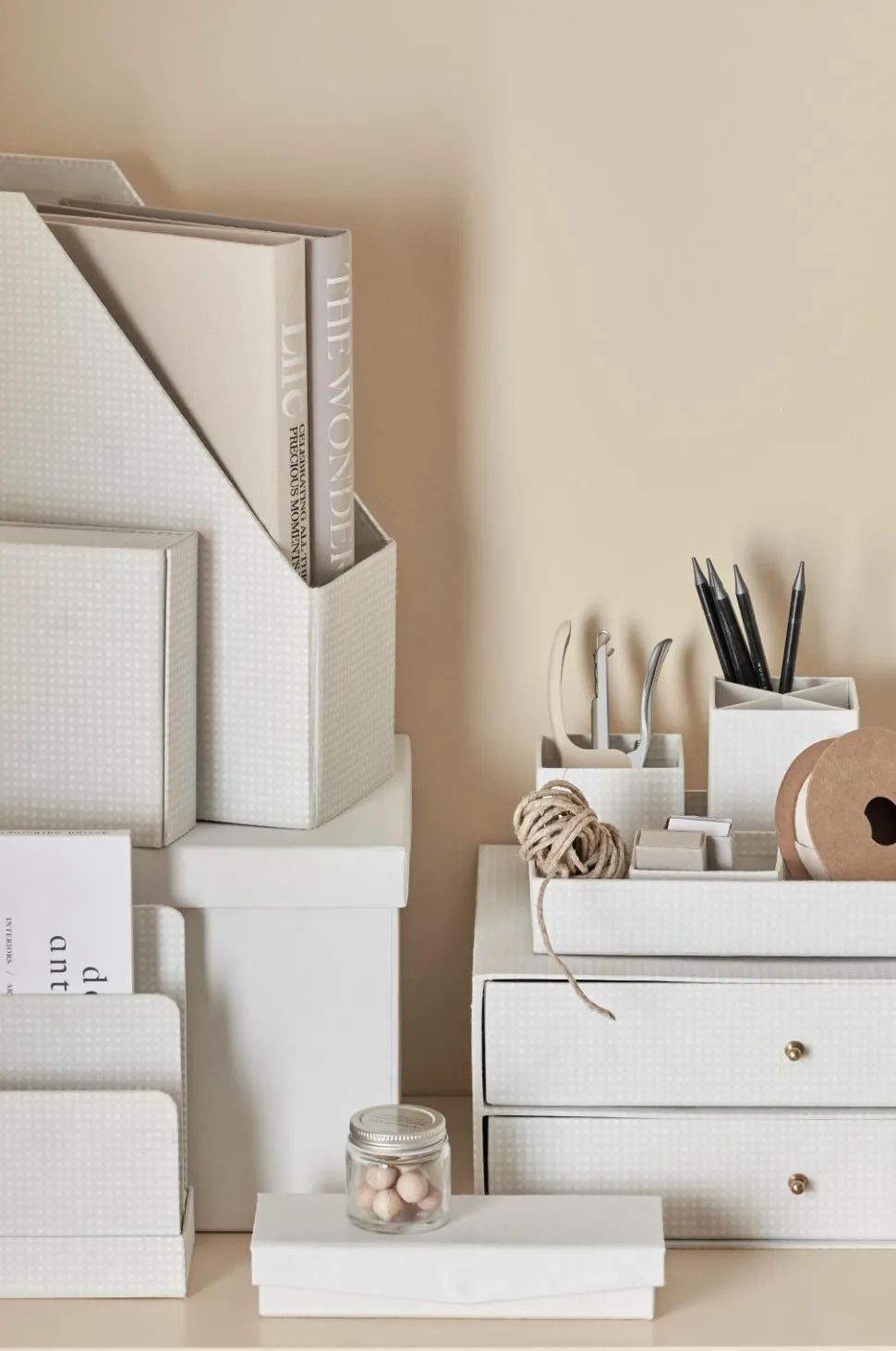 3 stk. opbevaringsbokse i forskellige størrelser med låg. Af genindvundet, håndlavet papir/karton.