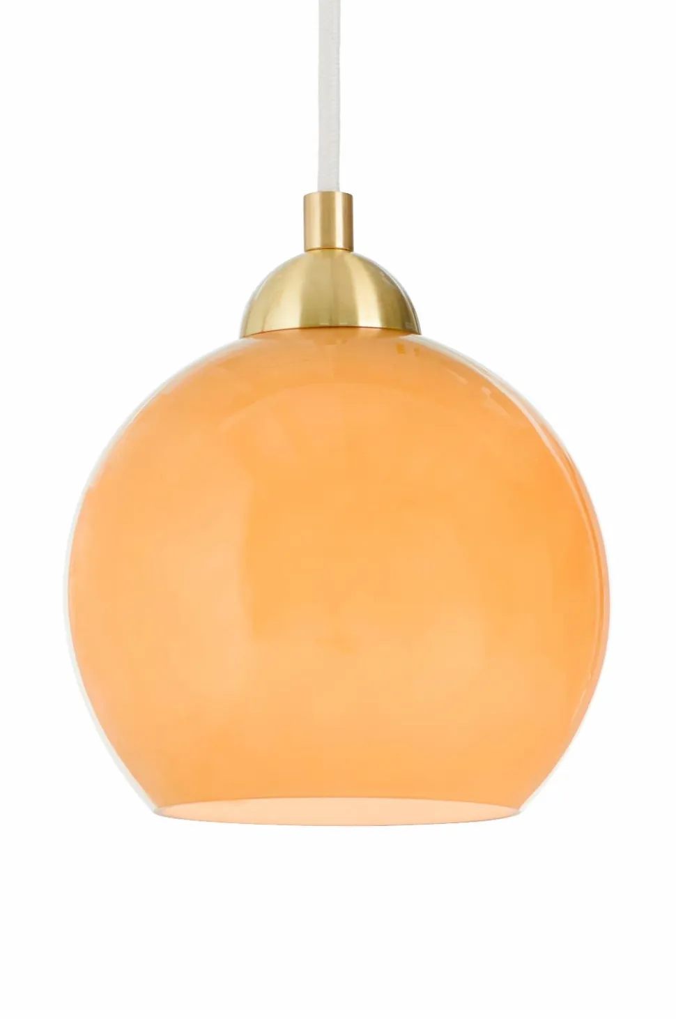 Pendel af malet, blankt glas. Detaljer i metal med børstet messingfinish. Stofledning med afbryder og stik. Pære medfølger ikke.