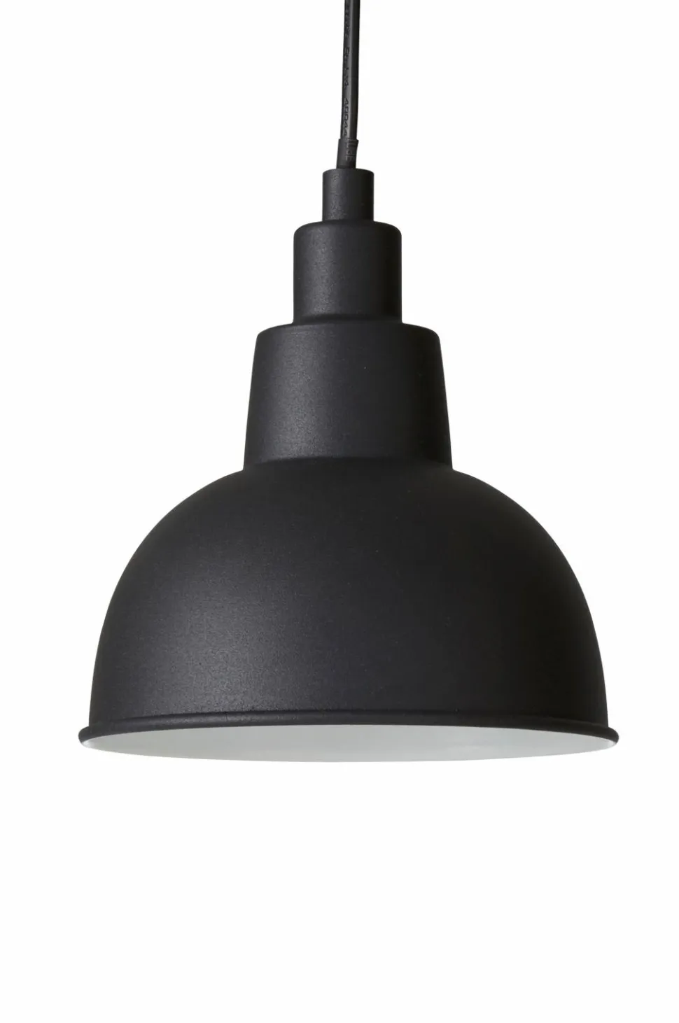 Pendel med skærm af mat, malet metal med hvid, blank inderside. Skærmens højde ca. 18 cm, diameter ca. 15 cm. Ledning med strømafbryder og stik, ledningslængde 3,5 m. Pære medfølger ikke.
