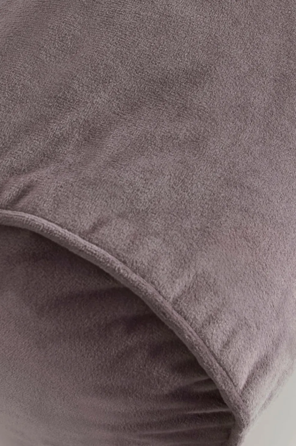 Cylinderformet pude i velour med monteringspude i polyester. Paspoleret kant i enderne. Af genindvundet polyester. Lynlås på undersiden. Bredde 55 cm, diameter 18 cm.