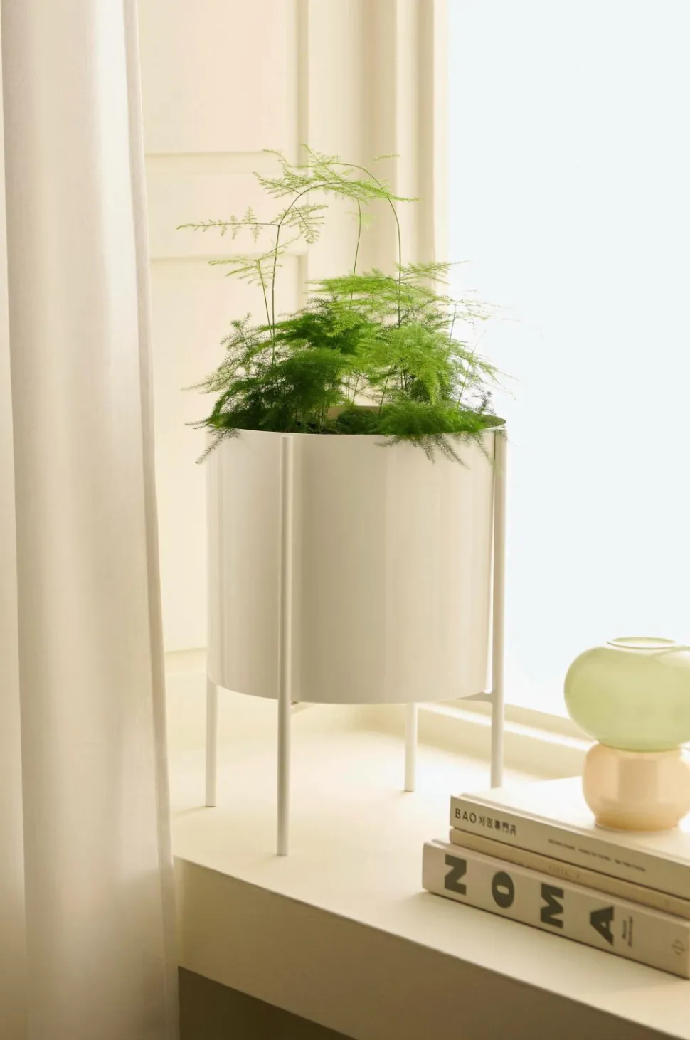 Potteskjuler af jern med stativ på 4 ben. Stativet er vendbart, og urtepotteskjuleren kan placeres på begge sider af stativet for forskellig højde. Krukkens mål: Højde 22 cm, Ø 25 cm. Placeret i stativet er den højeste højde 45 cm og den lavere højde 35 cm.
