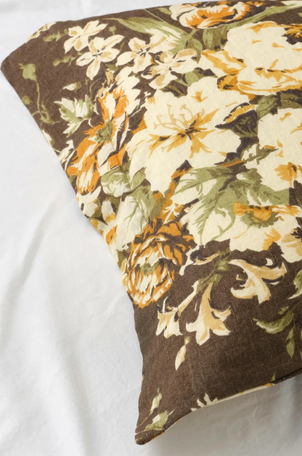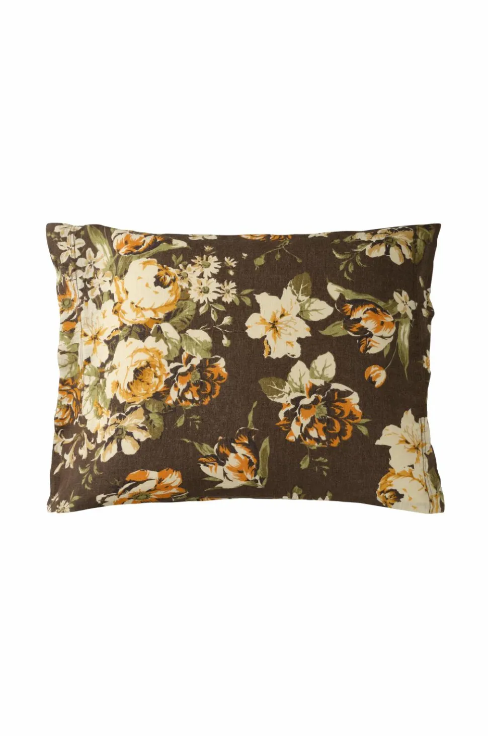 Pudebetræk i vintagevasket hørkvalitet af fransk hør med printet rosemønster på synlig lærredsbund. Str. 50×60 cm + 5 cm vinge på kortsiderne.