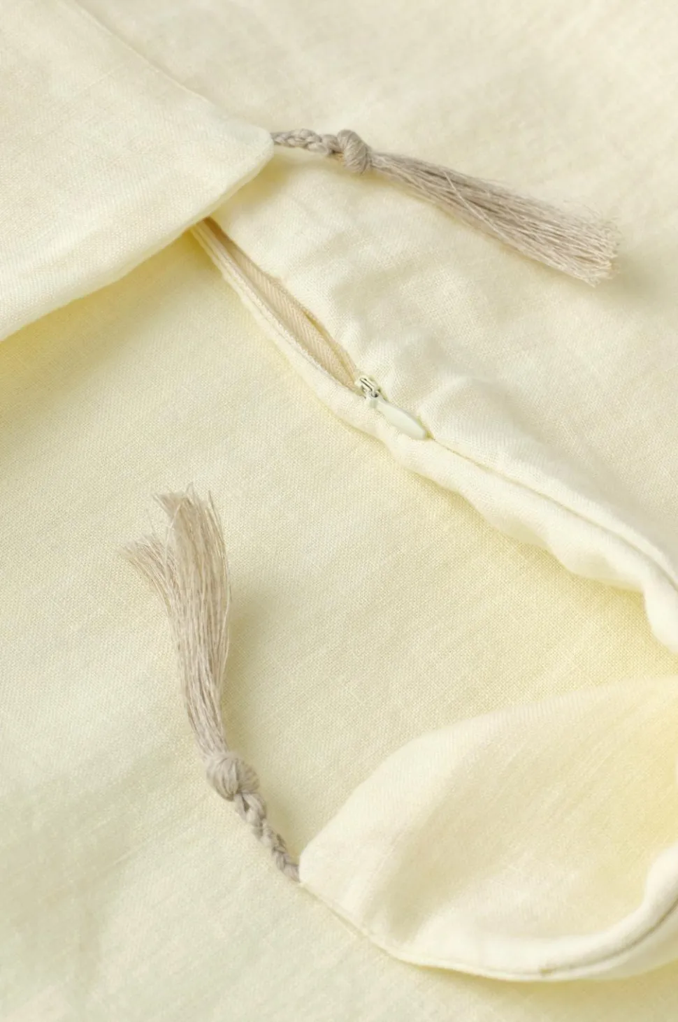 Siddehynde i blød vasket kvalitet af fransk hør med vintagelook og dekorative, håndsyede sting. Kvaste af hørgarn i alle hjørnerne. Skjult lynlås i bunden. Str. 50×50 cm.