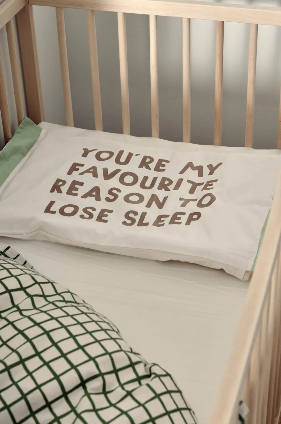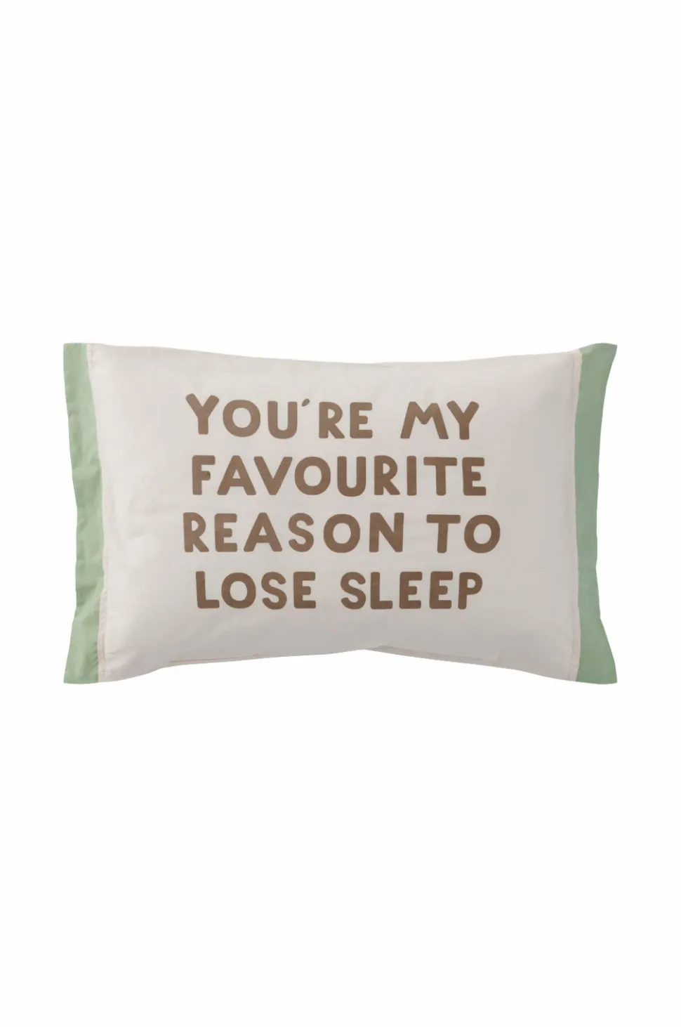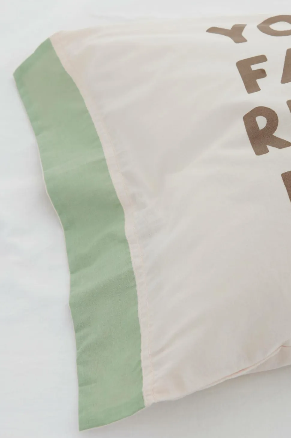 Pudebetræk i økologisk, vasket bomuld med printet tekst på forsiden og ensfarvet bagside. Trådtæthed 144 TC. Dobbelte jeanssømme hele vejen rundt. 25 cm ombuk. Str. 38×55 cm + 5 cm vinge på to sider.