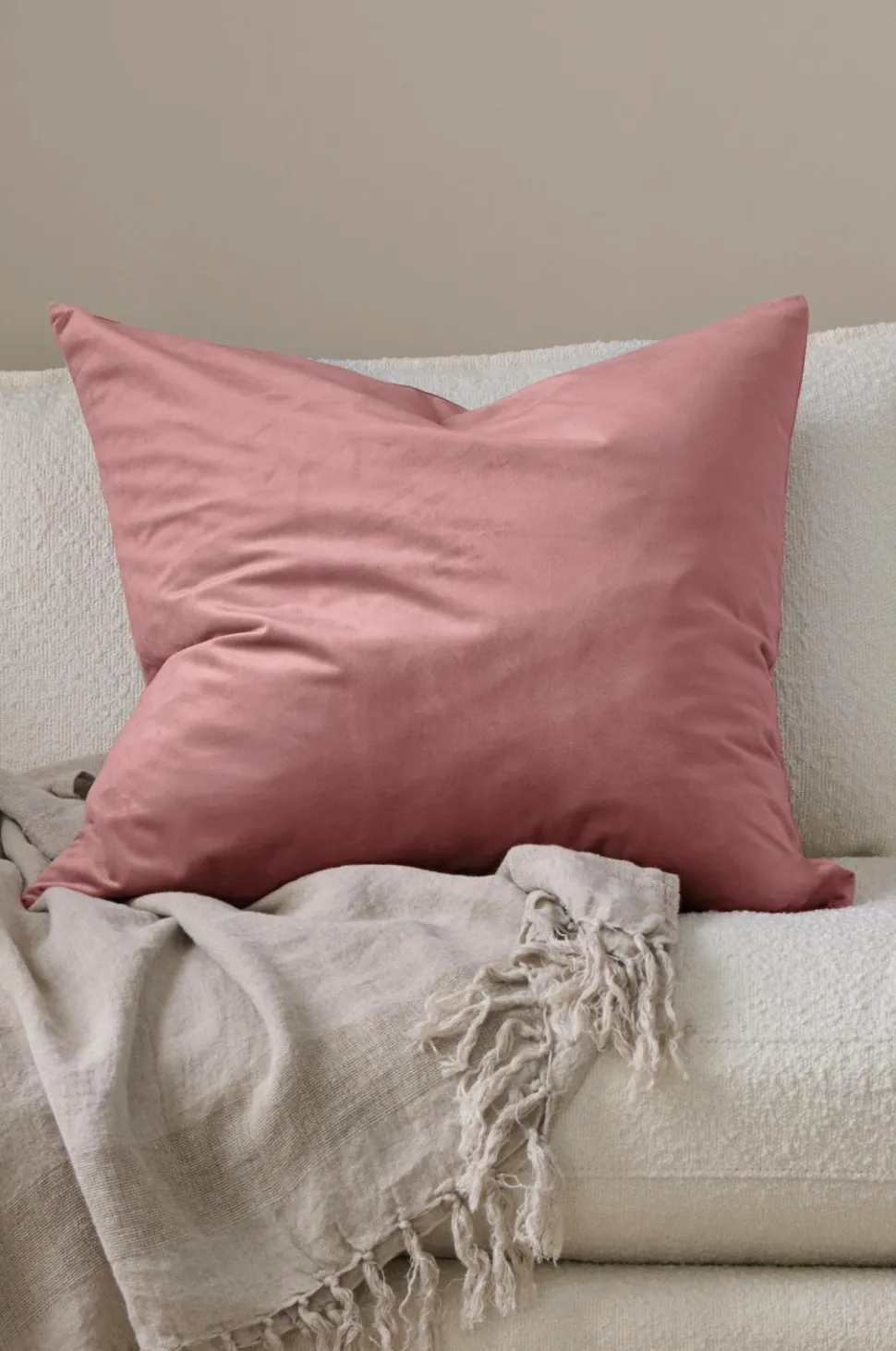 Pudebetræk af velour med fin glans. Af genindvundet polyester. Lynlås i bunden.