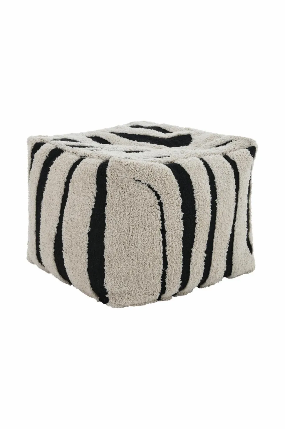 Puf med betræk i tuftet bomuldsstof. Betrækket er aftageligt og kan håndvaskes (ikke maskinvask). Fyld af plastkugler (thermocol).