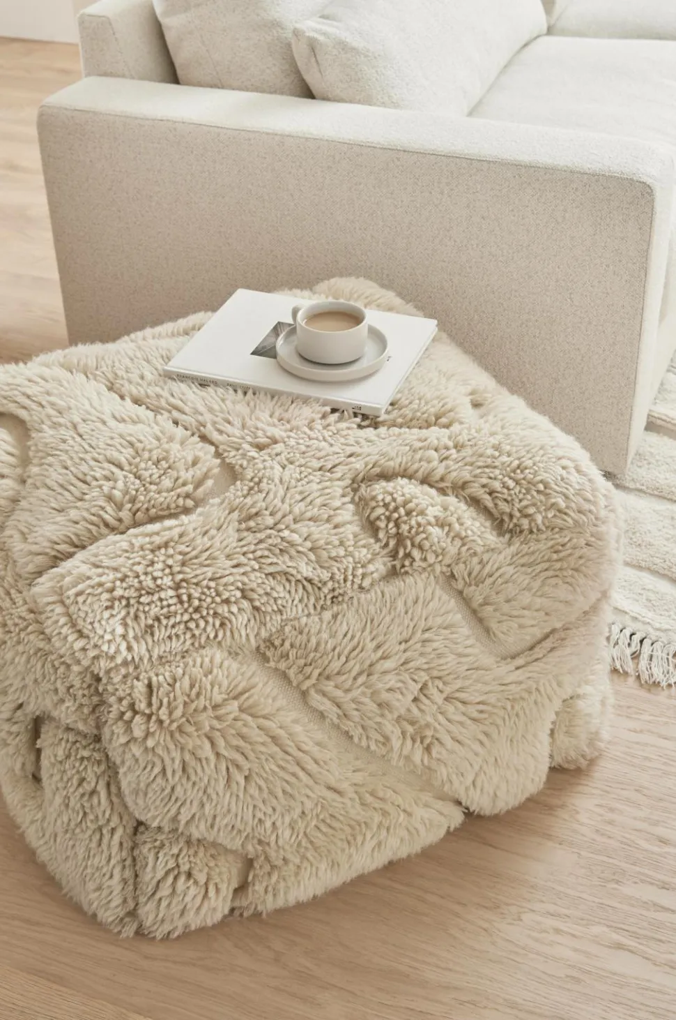 Puf af uld med tuftet, ryalignende mønster. Luvhøjde: 3,5 cm. Aftageligt betræk. Bund af bomuld. Fyld af plastkugler (thermocol).