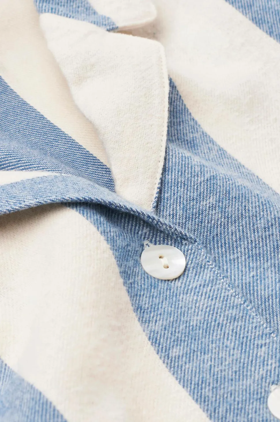 Pyjamasskjorte i økologisk bomuldsflonel med garnfarvede striber. Vasket kvalitet med blød, børstet overflade. Lige snit med lange ærmer. Krave med revers. Længde 61 cm i størrelse S.