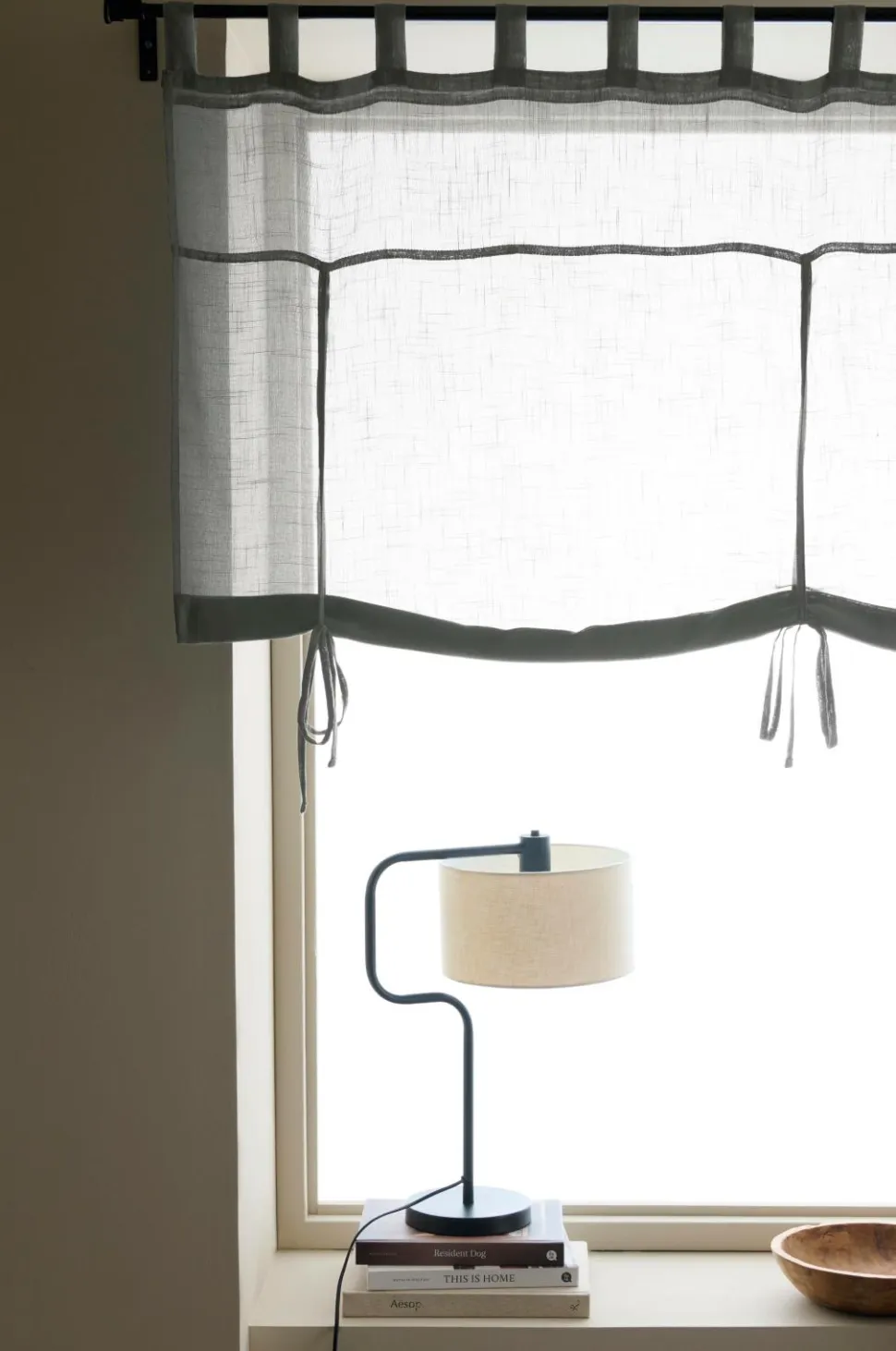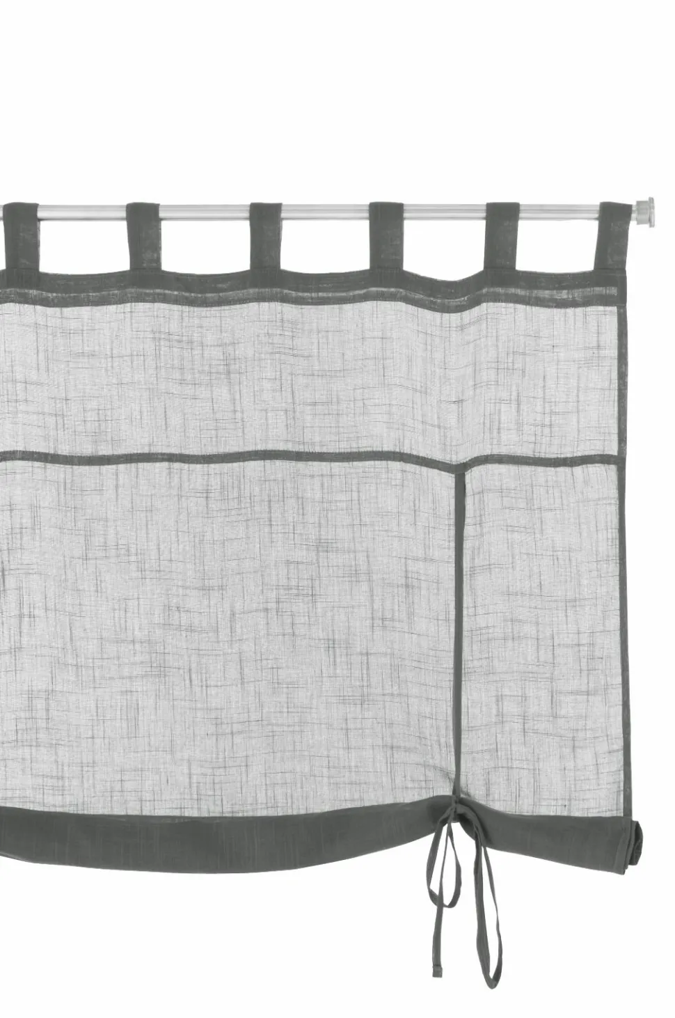 Roll up-gardin af luftig polyester med struktur i hørlook. Gardinet rulles op og fastgøres med bindebånd. Med stropper som trædes på gardinstang. Anvend gerne en rundstok forneden (medfølger ikke).