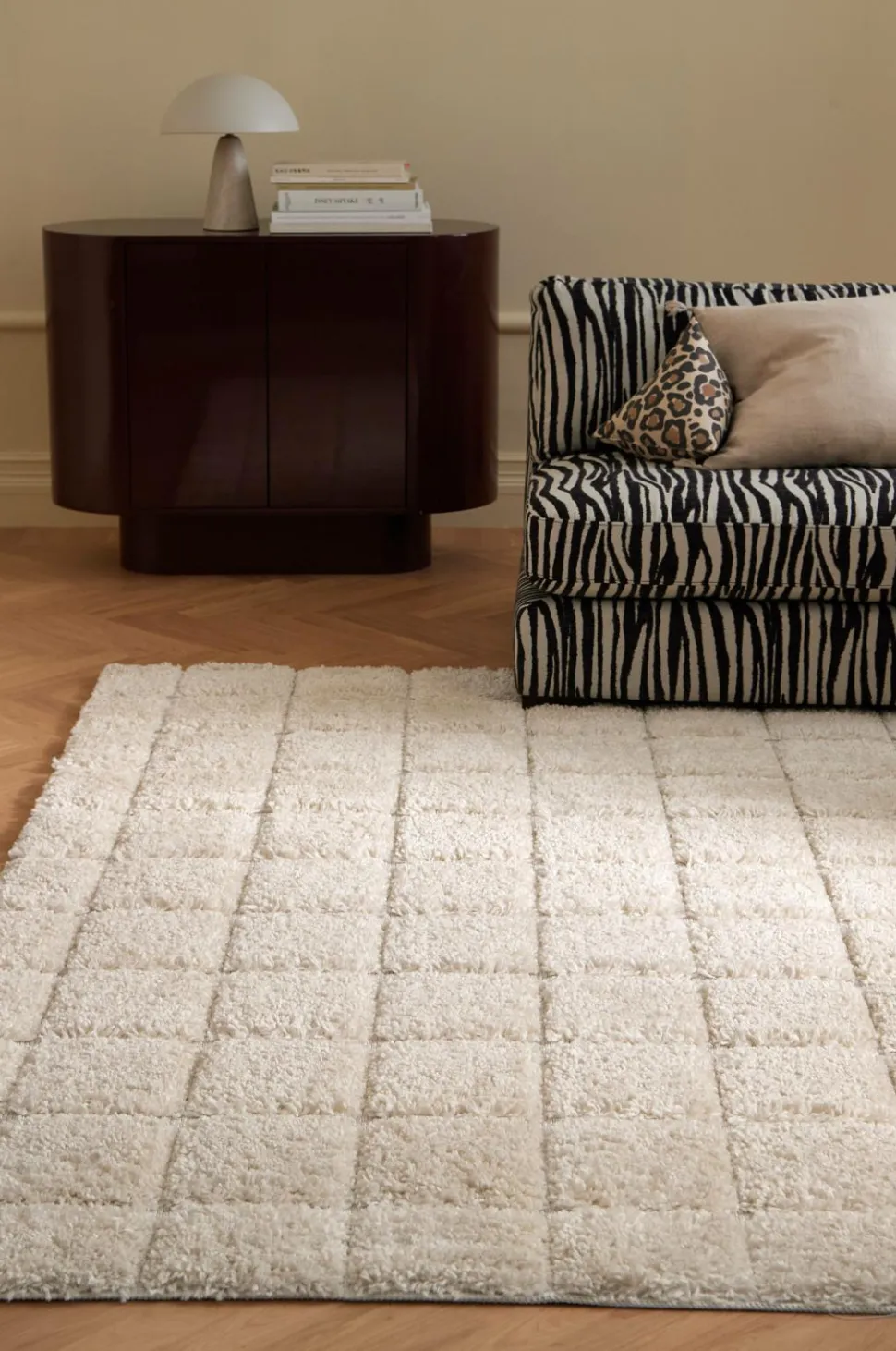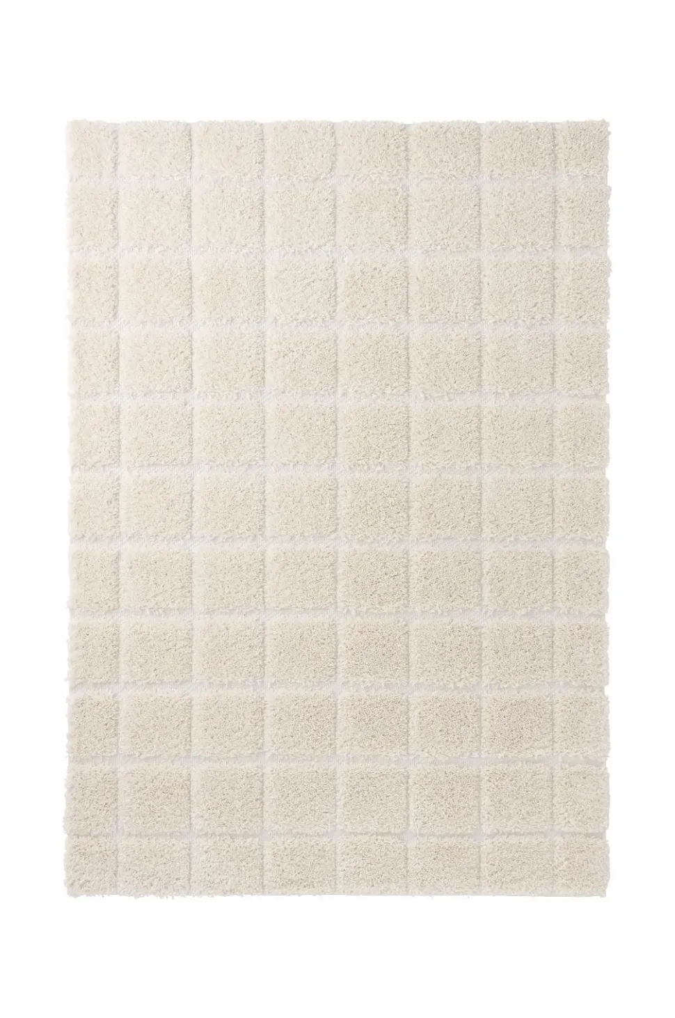 • Tuftet, vedligeholdelseslet ryatæppe med tæt, tyk luv og ternet reliefmønster