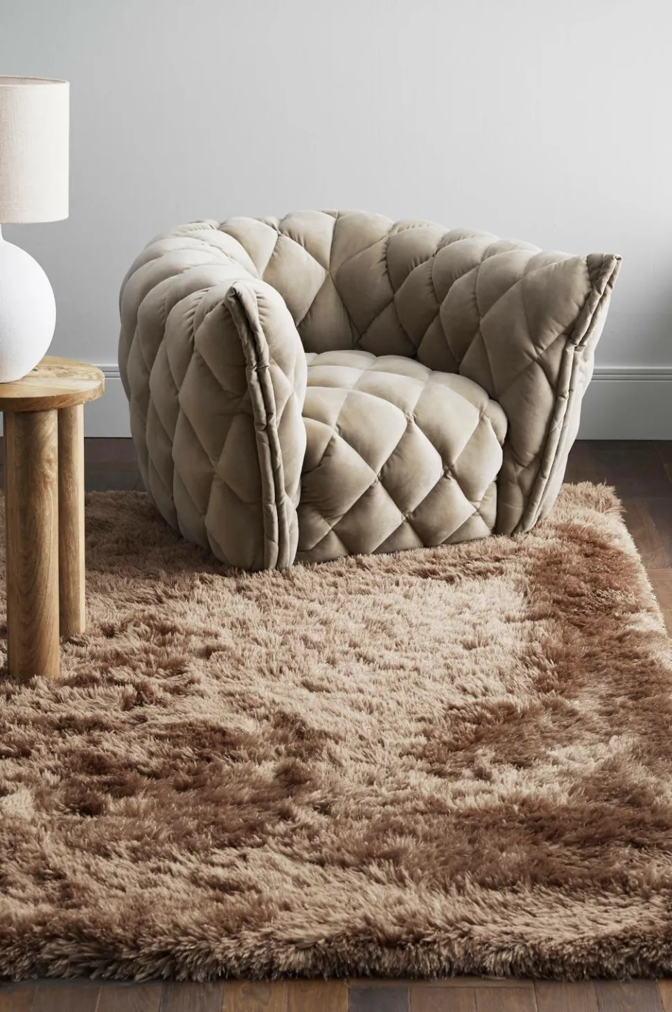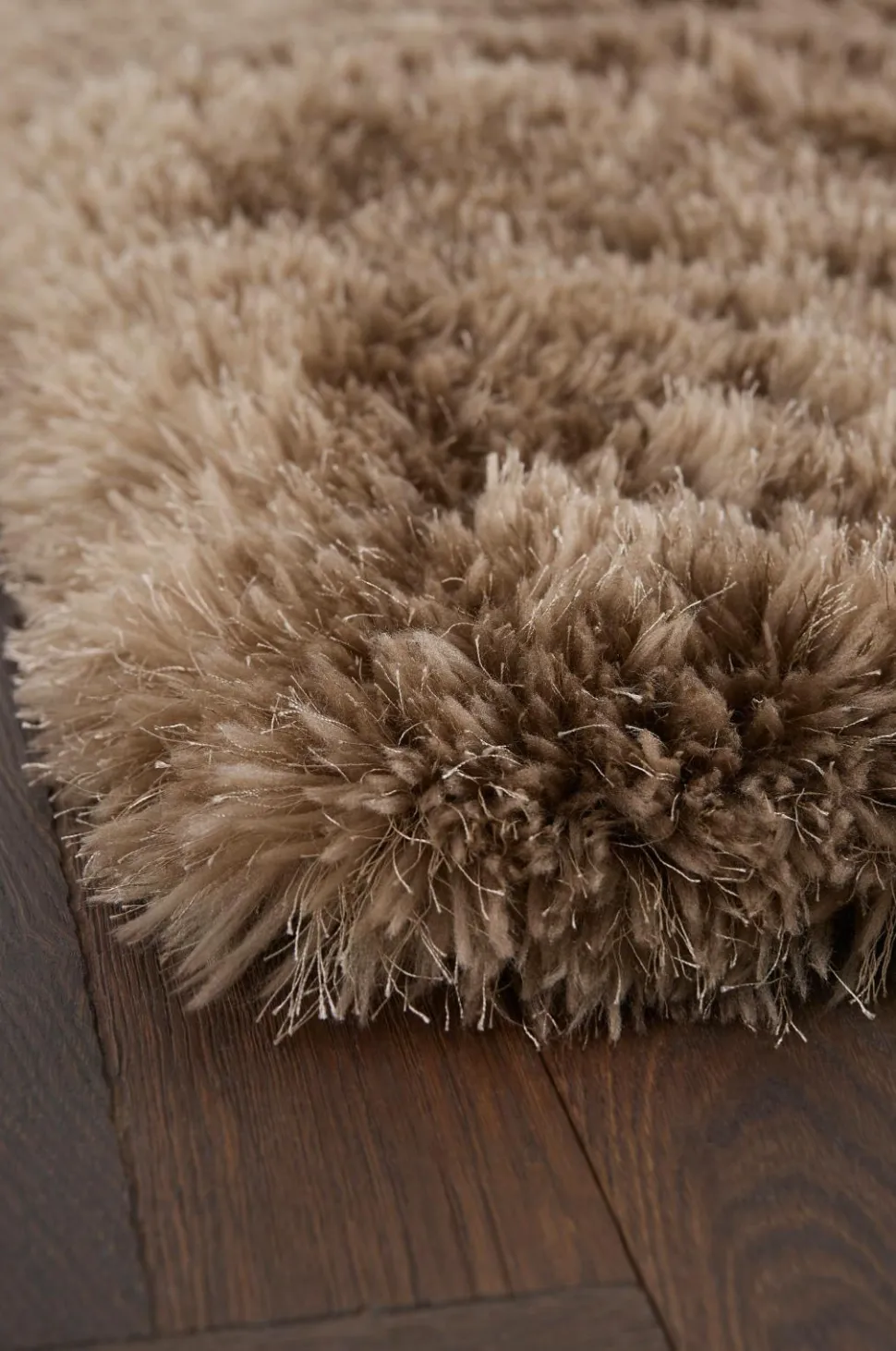 Ryatæppe med meget blød og tæt luv i to forskellige garner, en mat og en blank, som giver et levende udtryk. Luvhøjde 7 cm.