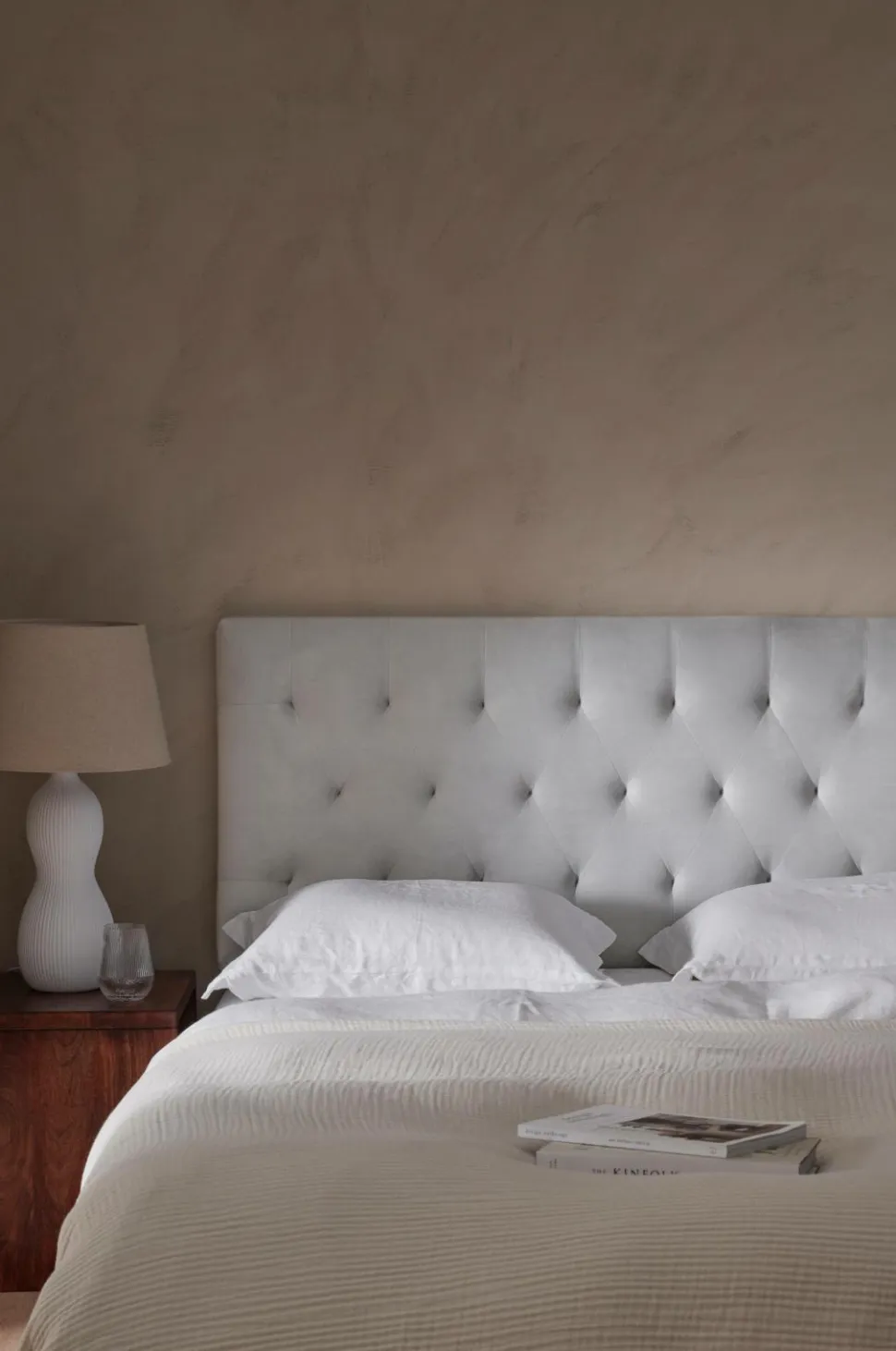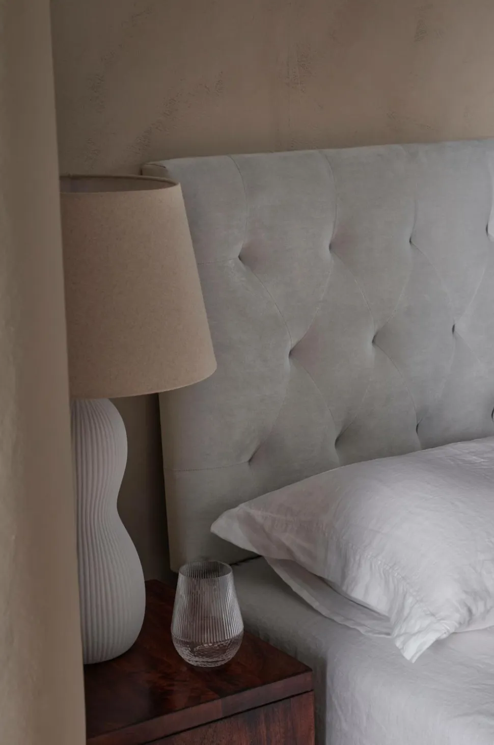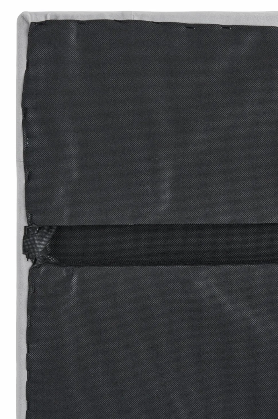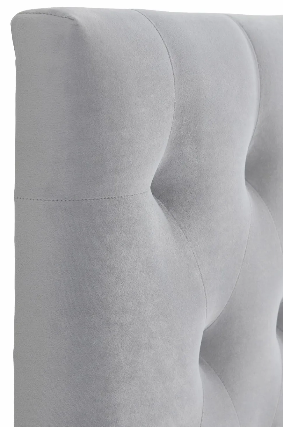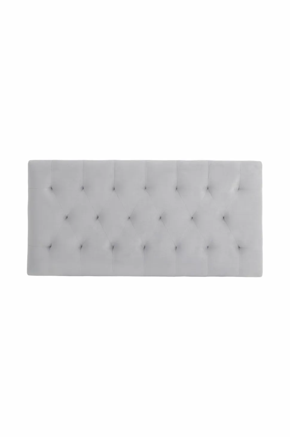 Polstret sengegavl som fastgøres på væggen (to kroge på bagsiden). Stel af fyrretræ og plywood. Betræk i velour af polyester og fyld af polyeter.