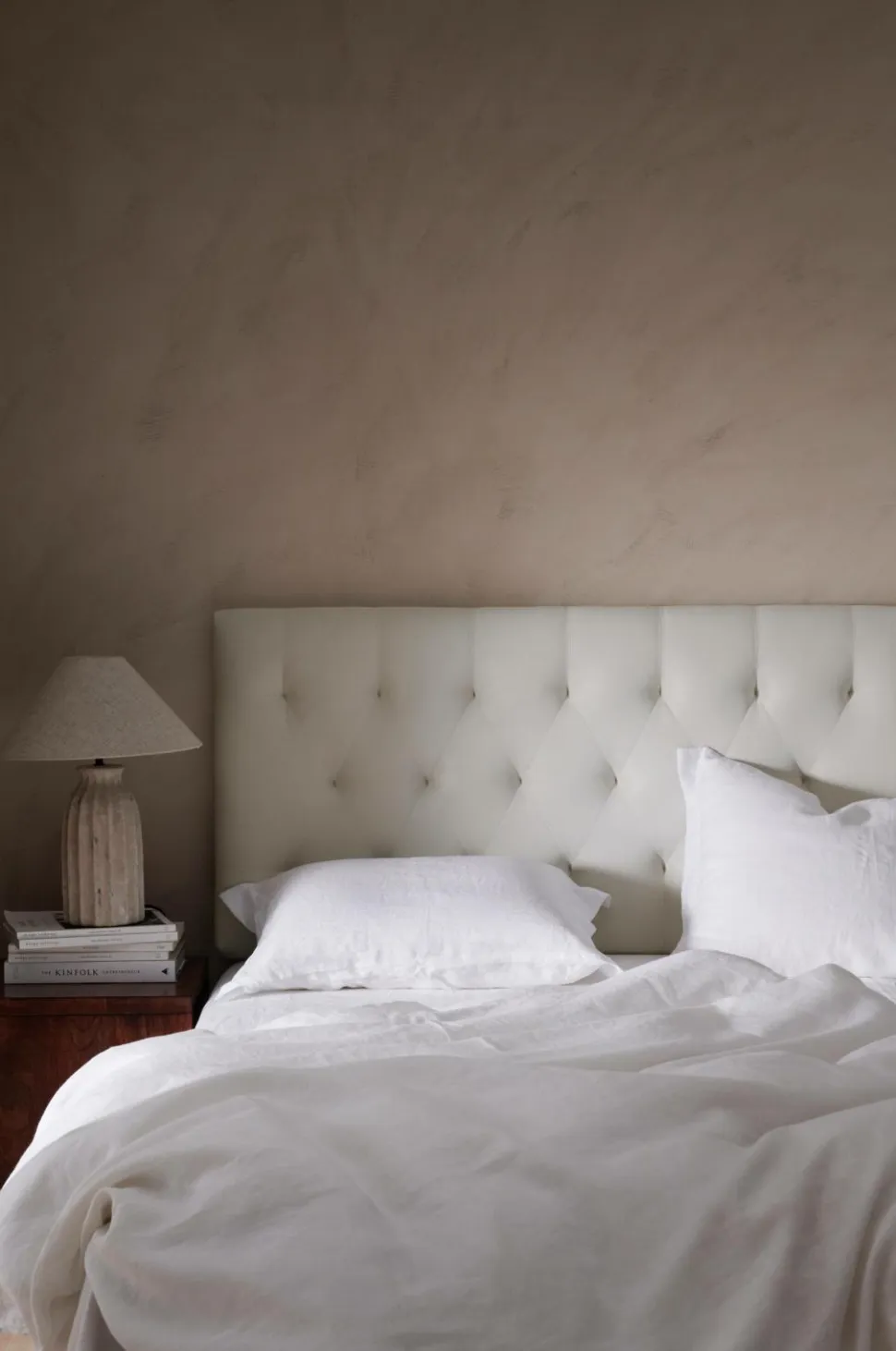 Polstret sengegavl som fastgøres på væggen (to kroge på bagsiden). Stel af fyrretræ og plywood. Betræk i velour af polyester og fyld af polyeter.