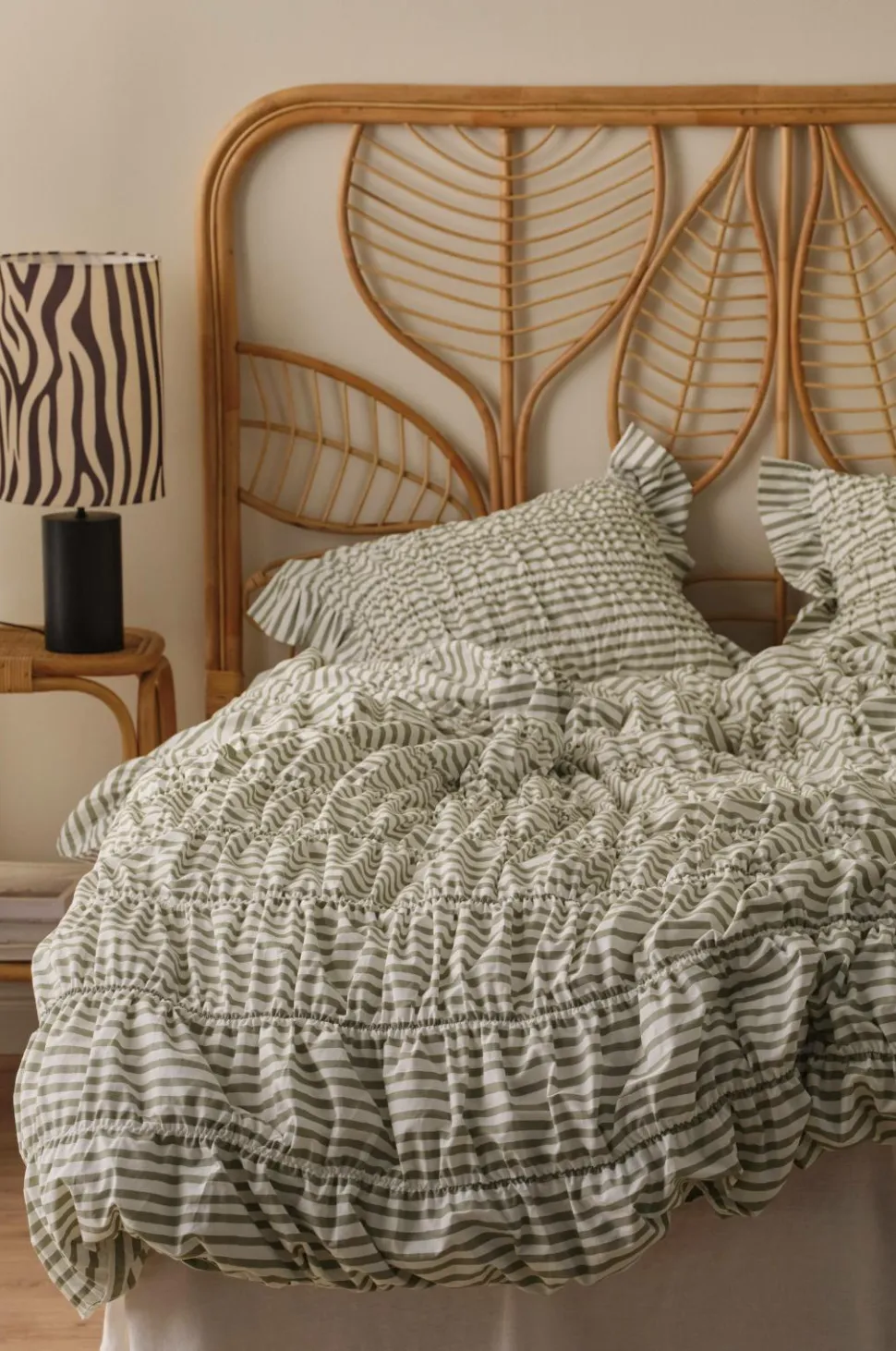 • Forsiden af dynebetrækket og pudebetrækket har en blød, elastisk linning med en dekorativ rynkeeffekt.