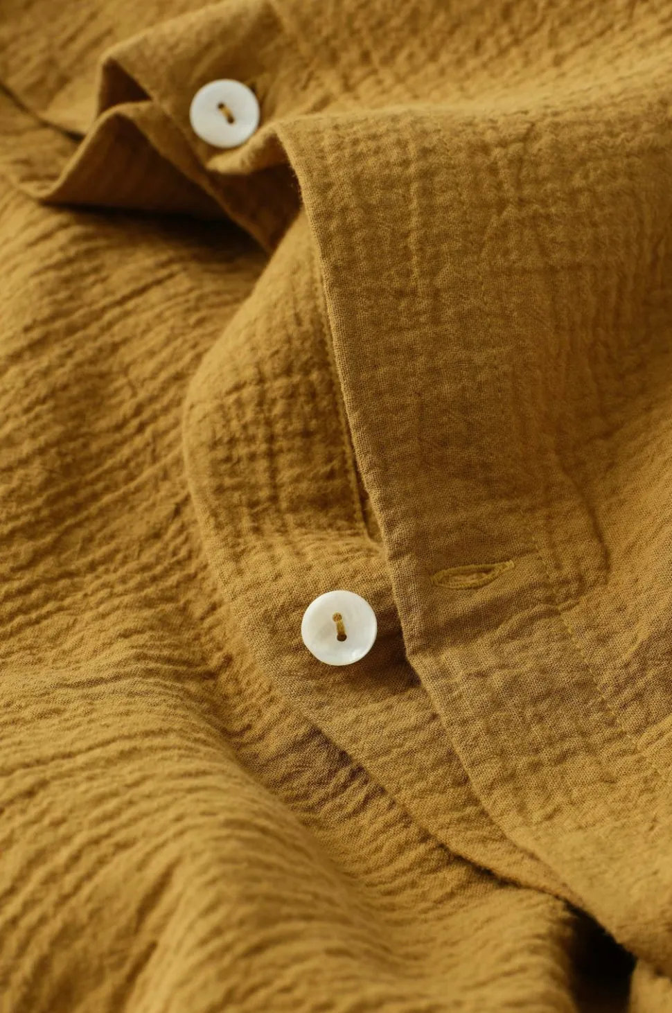 Sengesæt i 2 eller 3 dele. Af vasket, økologisk bomuldsmuslin i 2 lag. Dynebetrækket har knapper i kanten forneden. Pudebetrækket har 2,5 cm vinge rundt om. Trådtal: 230 TC. Muslin er et superblødt, luftigt og let struktureret stof med den velkendte rynkede effekt.