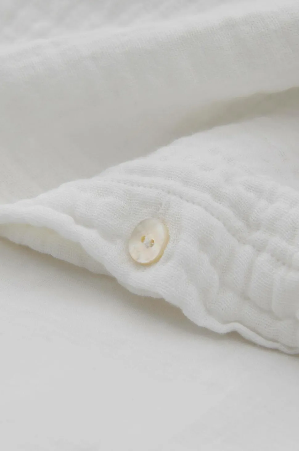 Sengesæt i 2 eller 3 dele. Af vasket, økologisk bomuldsmuslin i 2 lag. Dynebetrækket har knapper i kanten forneden. Pudebetrækket har 2,5 cm vinge rundt om. Trådtal: 230 TC. Muslin er et superblødt, luftigt og let struktureret stof med den velkendte rynkede effekt.