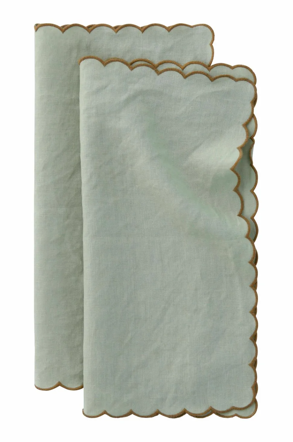 2 servietter i vasket hør med smuk struktur. Bølgekant med overlocksøm i kontrastfarve hele vejen rundt.
