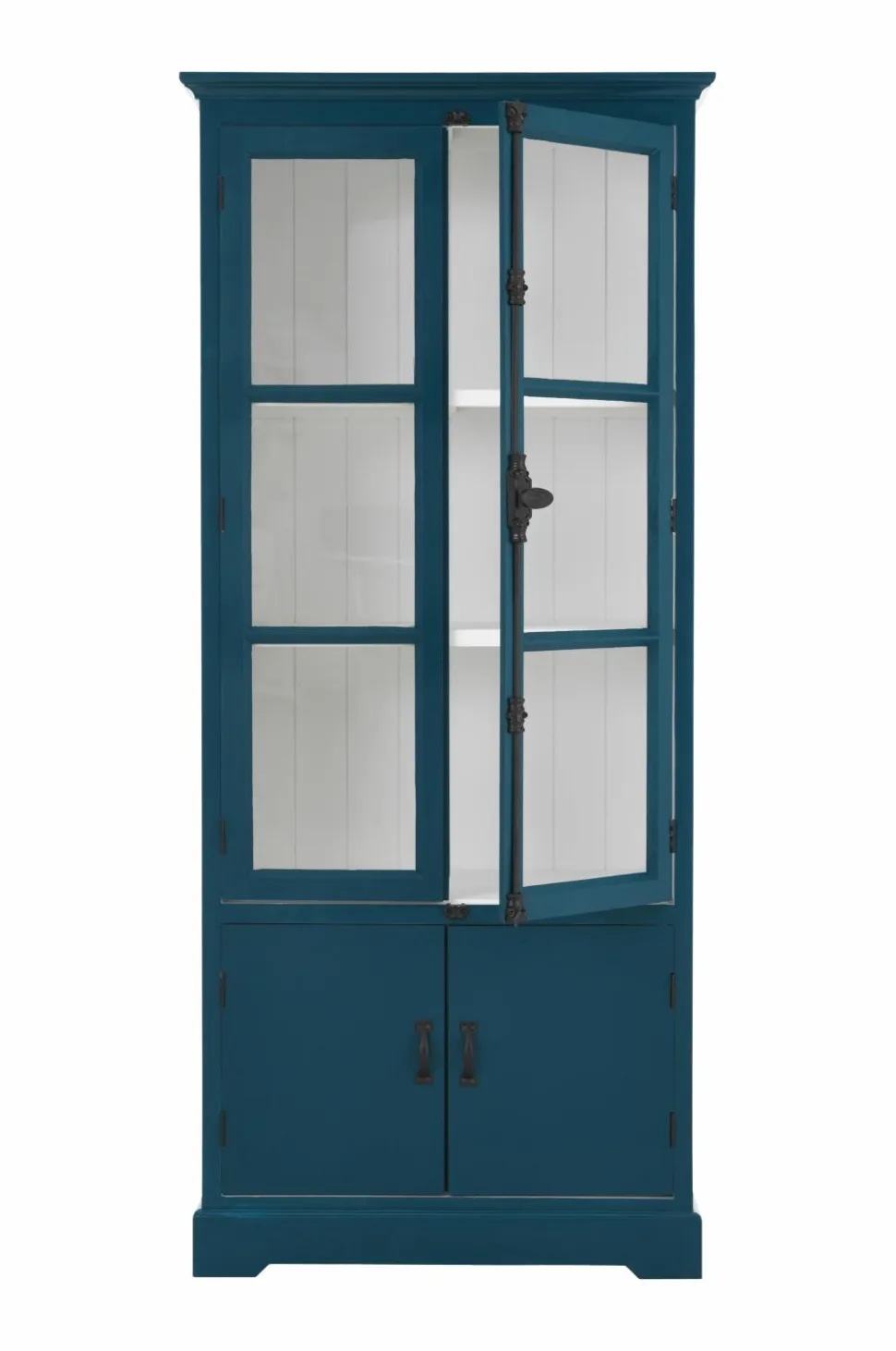 Skab med vitrinelåger og drejehåndtag. Bagstykke og bund af gran. Sidepaneler, overdel og hylder af MDF. Låger af MDF og glas, tykkelse 3 mm. 2 faste hylder af træ. Underskab uden hylder. Højde 180 cm. Dybde 40 cm. Bredde 80 cm. Maksimal belastning pr. hylde 20 kg. Lev. monteret.