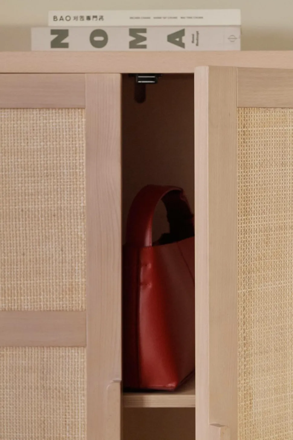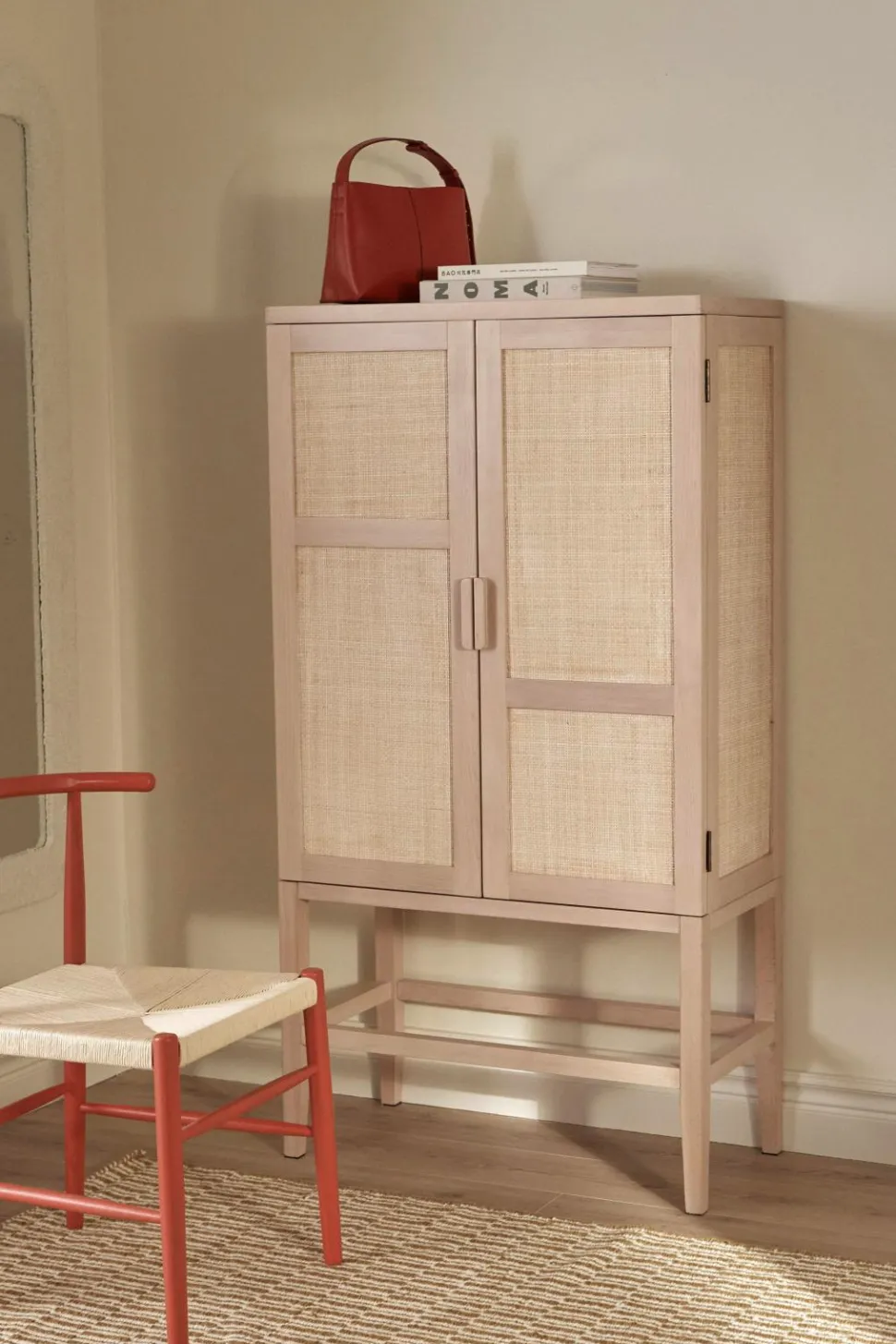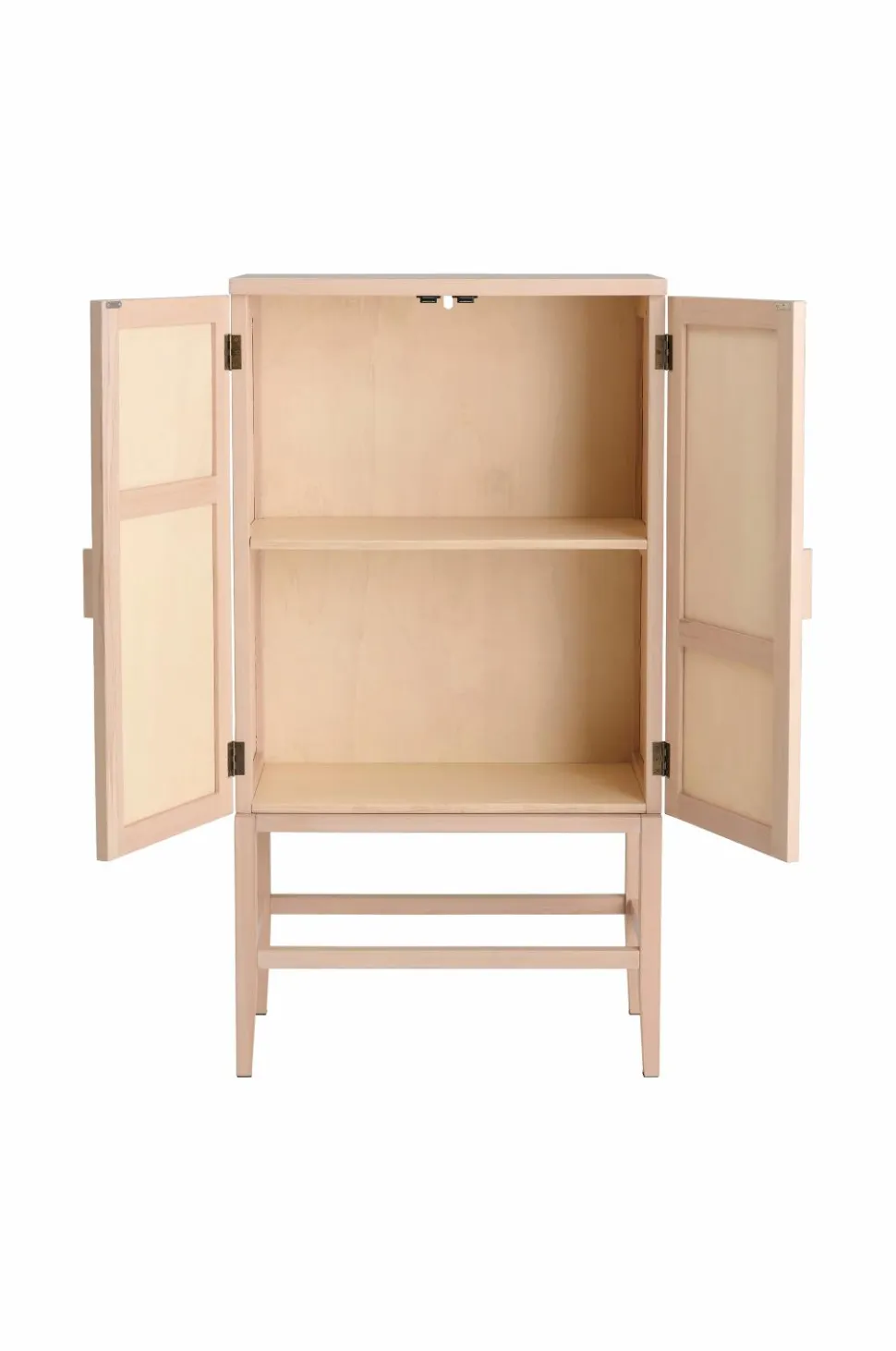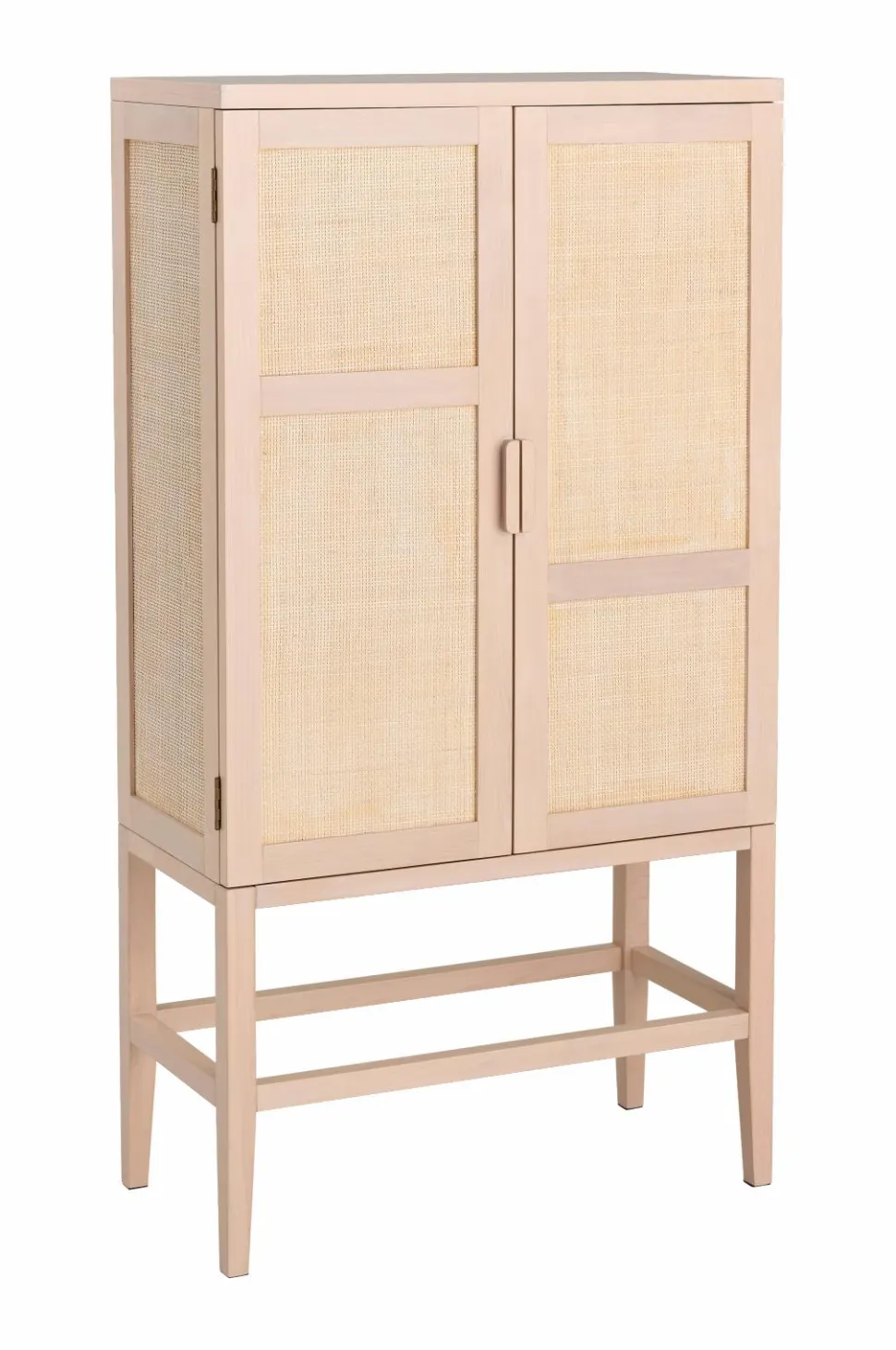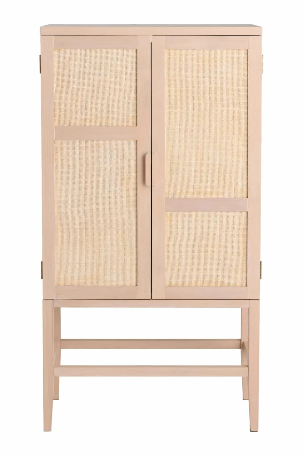 Et robust opbevaringsskab i et elegant design med rattan på dørene. Ideelt til opbevaring af tøj, bøger eller andre husholdningsartikler.