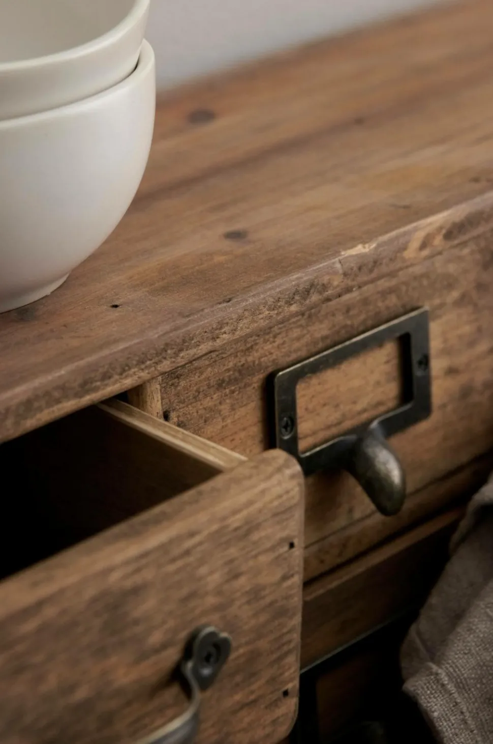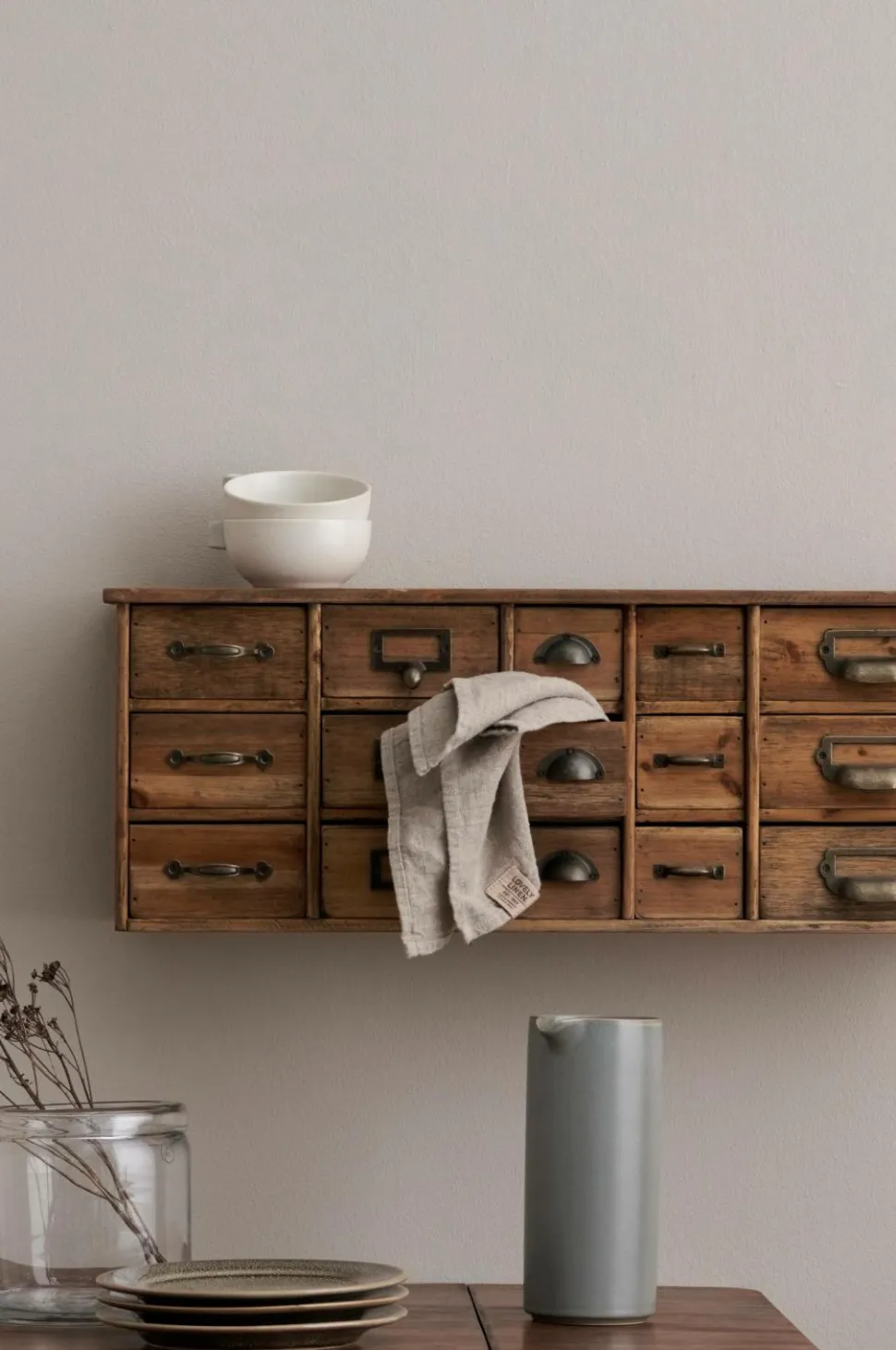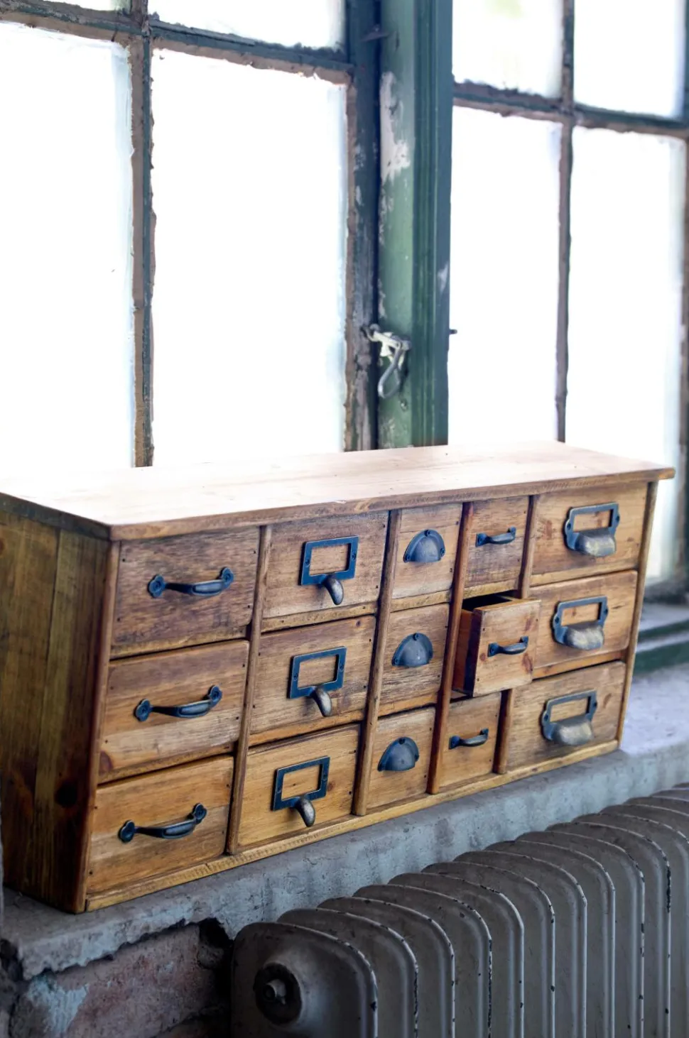 Kasse til småopbevaring som kan hænges på væggen eller stå. Af træ og metal med flot antikfinish. 15 små skuffer i forskellige størrelser med forskellige typer af håndtag. Plads til etiketter på 6 af skufferne.