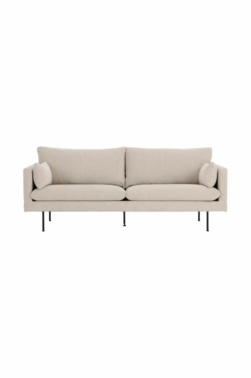 3-pers. sofa med ben af metal. Ramme i fyrretræ med vævbånd og nozagfjedre. Betræk i 100% polyester. Martindale > 25000. Fyld af polyeterskum. Betrækket er aftageligt på ryg- og siddehynder. 2 armlænspuder medfølger. Frihøjde under møbel 20 cm. Lettere samling.