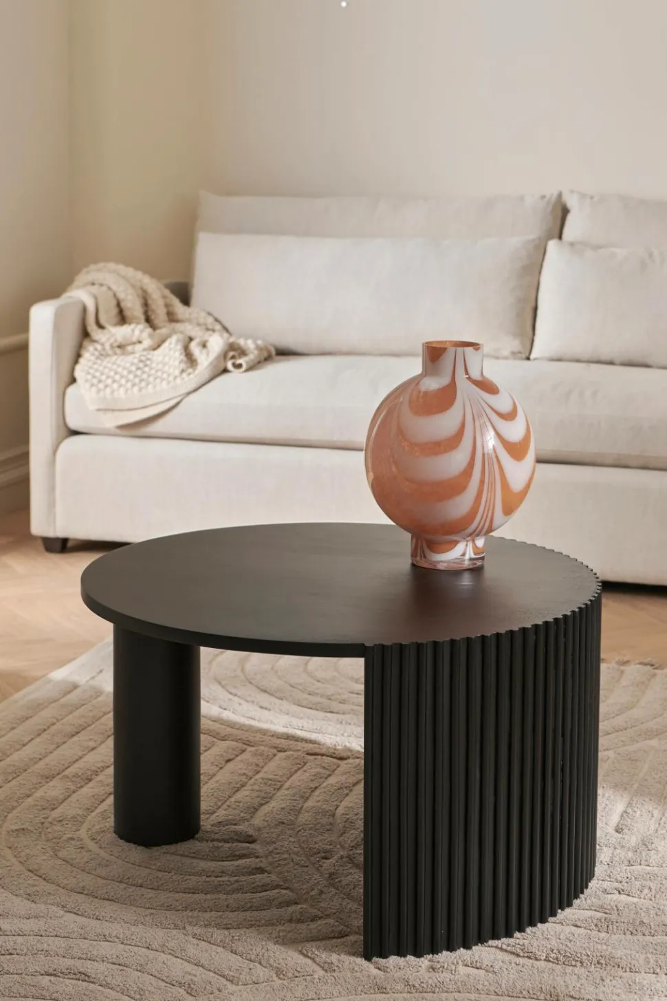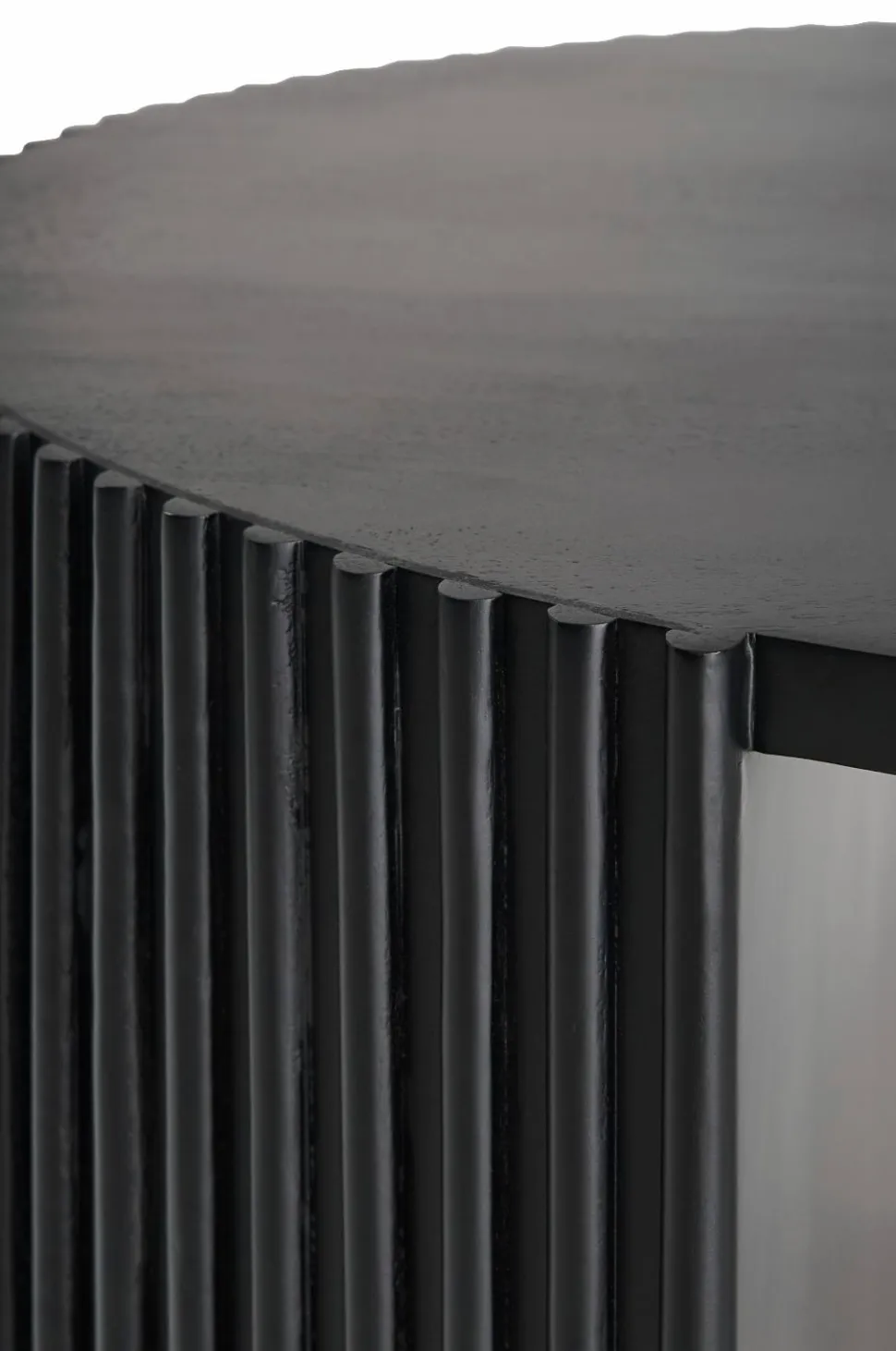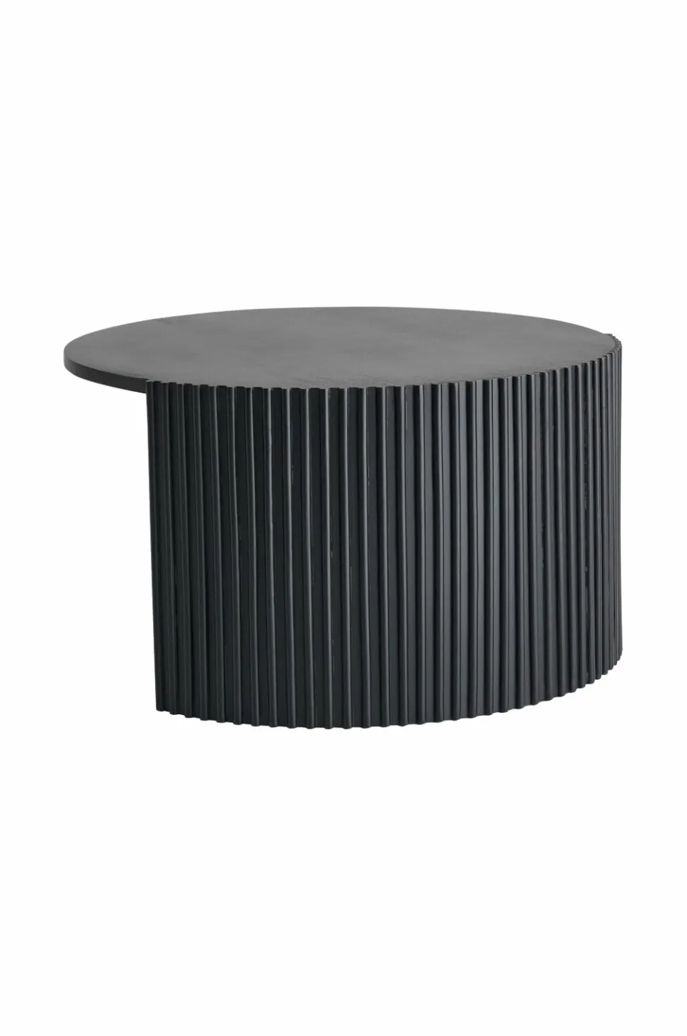 Sofabord i mangotræ. Understel med riflet struktur og et rundt, kraftigt ben. Højde 45 cm, diameter 80 cm. Samlet.