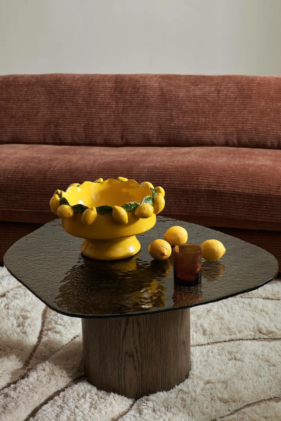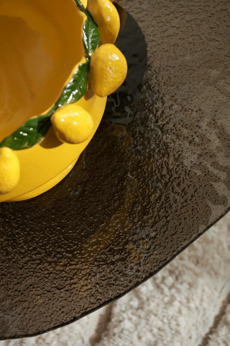 • Bordplade i hærdet, bronzefarvet glas med en lidt uregelmæssig form
