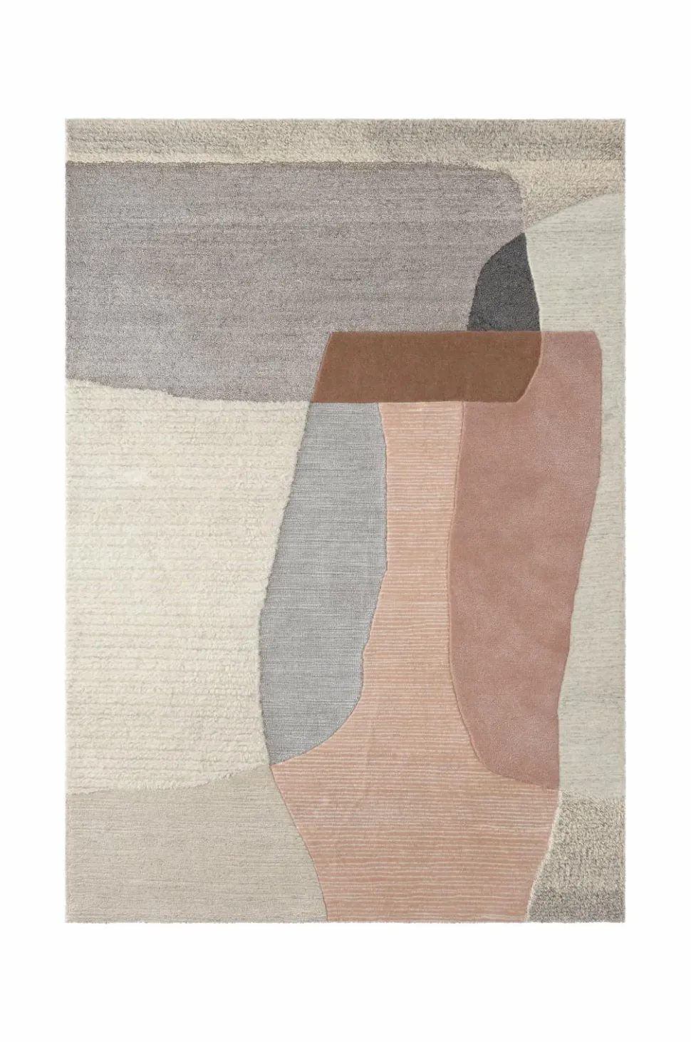 Håndvævet og håndknyttet uldtæppe med forskellige strukturer som skaber en patchwork-effekt. Bagside i bomuld. Tæppets tykkelse 1,5 cm.