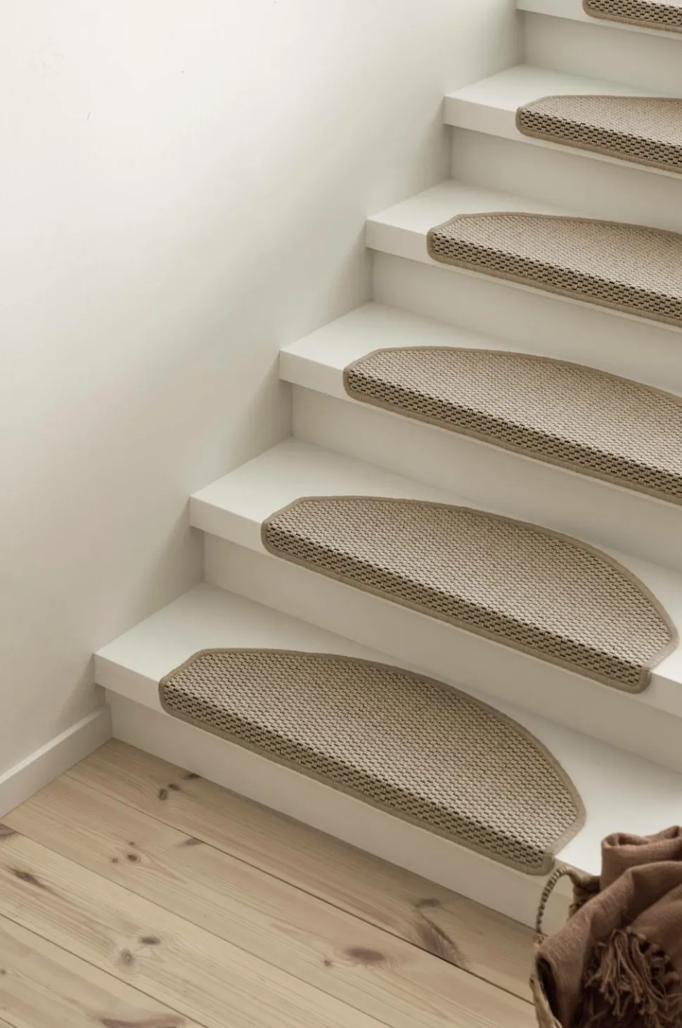 Trappetrinsmåtte i 12-pak. Vævet i sisallignende struktur med riede kanter. Bagside af hård plastprofil og dobbeltklæbende tape.