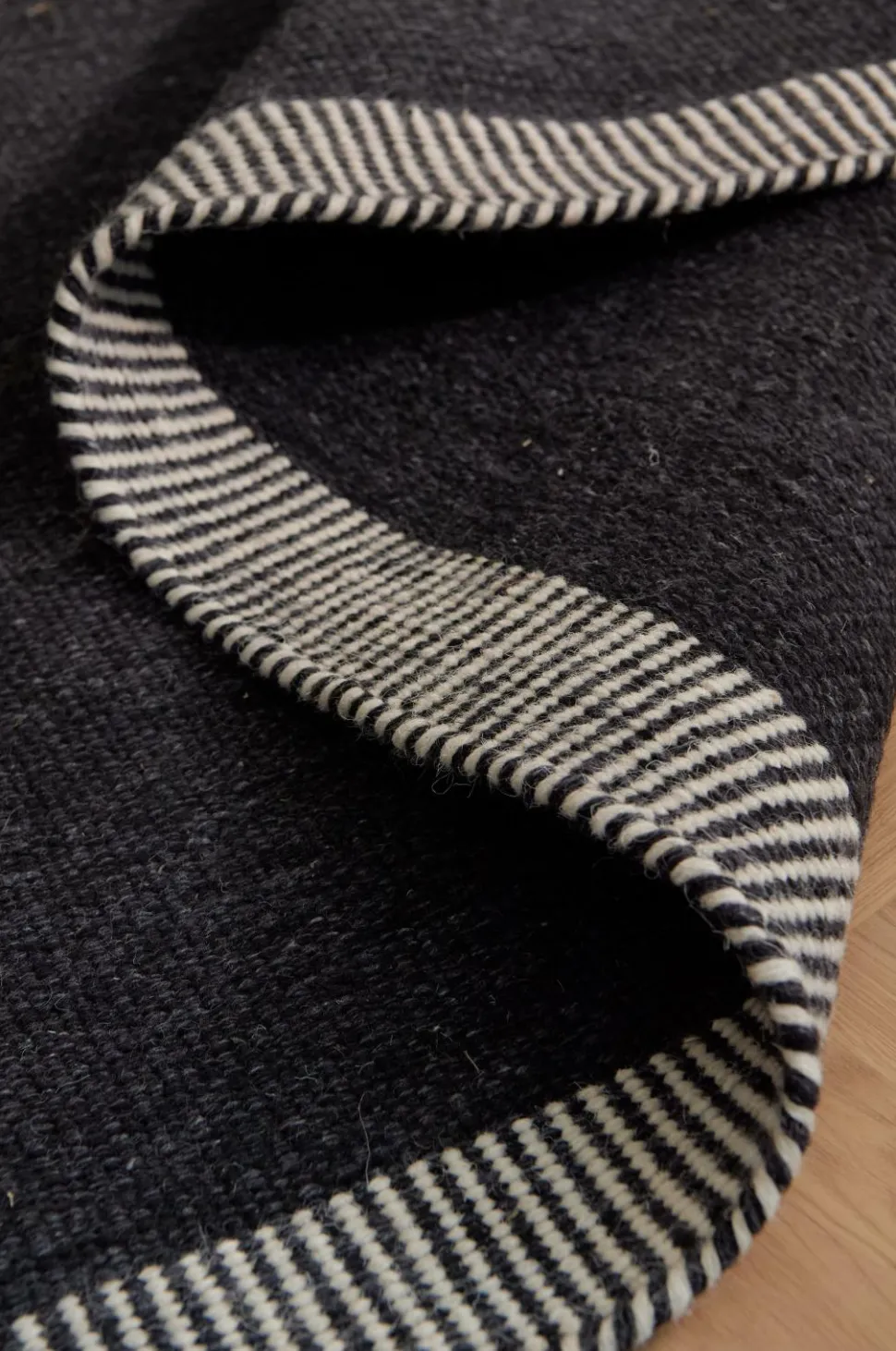 Håndvævet uldtæppe i meleret look. Stribet kant i enderne.
